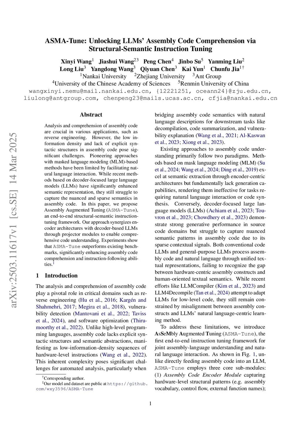Analysis and comprehension of assembly code are crucial in various applications, such as reverse engineering. However, the low information density and lack of explicit syntactic structures in assembly code pose significant challenges. Pioneering approaches with masked language modeling (MLM)-based methods have been limited by facilitating natural language interaction. While recent methods based on decoder-focused large language models (LLMs) have significantly enhanced semantic representation, they still struggle to capture the nuanced and sparse semantics in assembly code. In this paper, we propose Assembly Augmented Tuning (ASMA-Tune), an end-to-end structural-semantic instruction-tuning framework. Our approach synergizes encoder architectures with decoder-based LLMs through projector modules to enable comprehensive code understanding. Experiments show that ASMA-Tune outperforms existing benchmarks, significantly enhancing assembly code comprehension and instruction-following abilities. Our model and dataset are public atthis https URL.