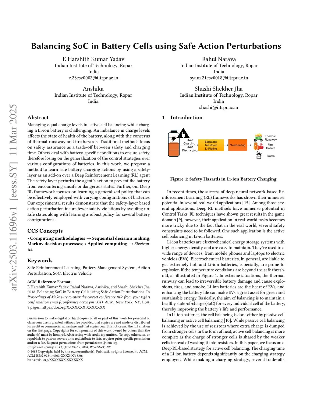 Balancing SoC in Battery Cells using Safe Action Perturbations