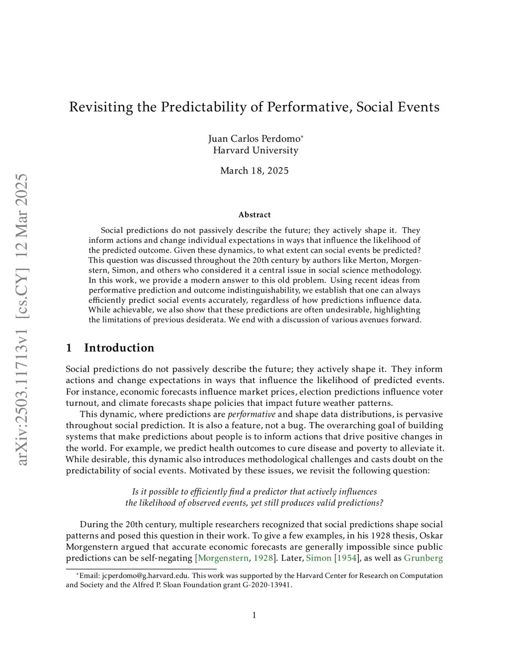 Social predictions do not passively describe the future; they actively shape it. They inform actions and change individual expectations in ways that influence the likelihood of the predicted outcome. Given these dynamics, to what extent can social events be predicted? This question was discussed throughout the 20th century by authors like Merton, Morgenstern, Simon, and others who considered it a central issue in social science methodology. In this work, we provide a modern answer to this old problem. Using recent ideas from performative prediction and outcome indistinguishability, we establish that one can always efficiently predict social events accurately, regardless of how predictions influence data. While achievable, we also show that these predictions are often undesirable, highlighting the limitations of previous desiderata. We end with a discussion of various avenues forward.