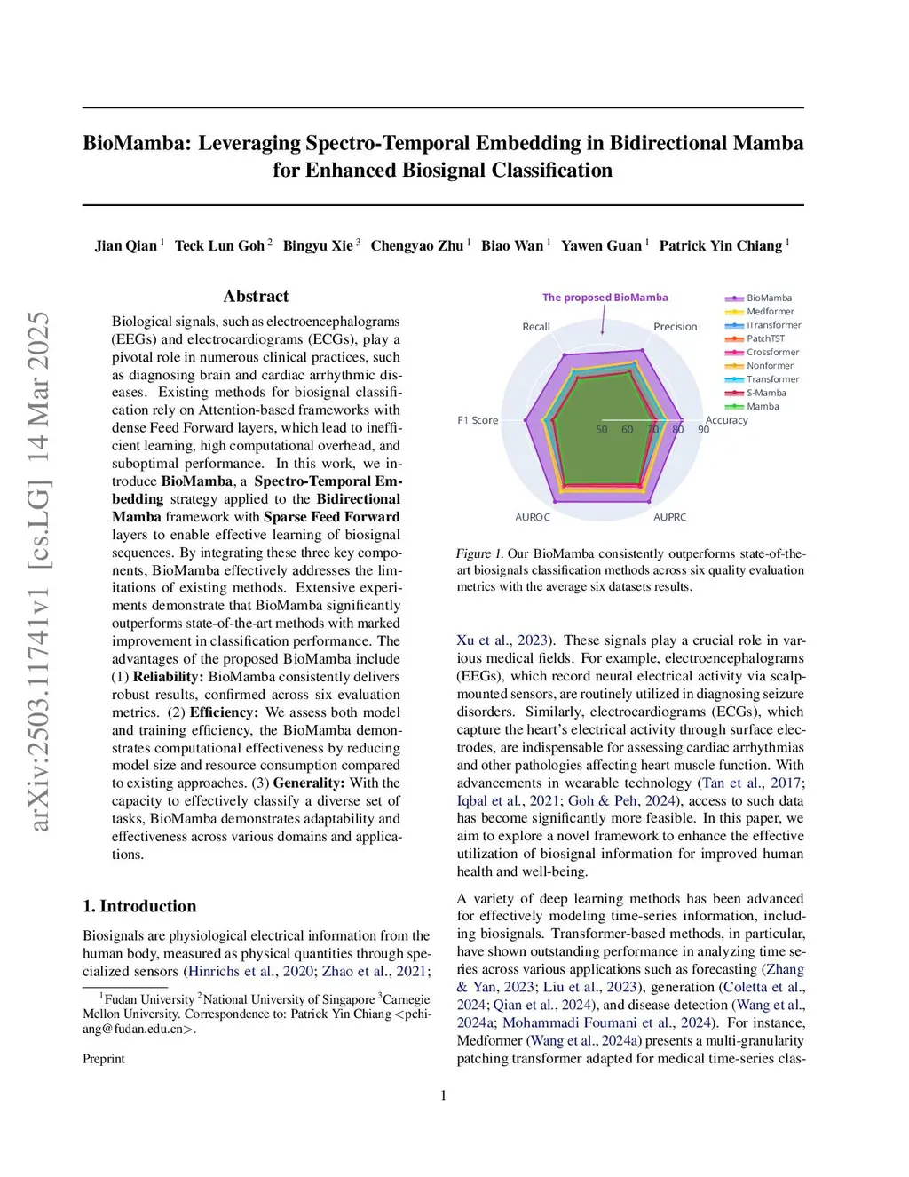 Biological signals, such as electroencephalograms (EEGs) and electrocardiograms (ECGs), play a pivotal role in numerous clinical practices, such as diagnosing brain and cardiac arrhythmic diseases. Existing methods for biosignal classification rely on Attention-based frameworks with dense Feed Forward layers, which lead to inefficient learning, high computational overhead, and suboptimal performance. In this work, we introduce BioMamba, a Spectro-Temporal Embedding strategy applied to the Bidirectional Mamba framework with Sparse Feed Forward layers to enable effective learning of biosignal sequences. By integrating these three key components, BioMamba effectively addresses the limitations of existing methods. Extensive experiments demonstrate that BioMamba significantly outperforms state-of-the-art methods with marked improvement in classification performance. The advantages of the proposed BioMamba include (1) Reliability: BioMamba consistently delivers robust results, confirmed across six evaluation metrics. (2) Efficiency: We assess both model and training efficiency, the BioMamba demonstrates computational effectiveness by reducing model size and resource consumption compared to existing approaches. (3) Generality: With the capacity to effectively classify a diverse set of tasks, BioMamba demonstrates adaptability and effectiveness across various domains and applications.