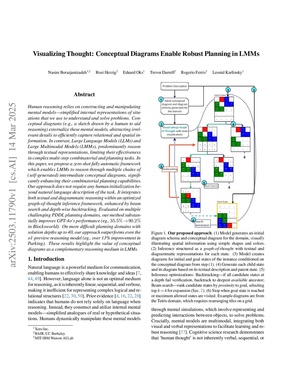 Human reasoning relies on constructing and manipulating mental models -- simplified internal representations of situations used to understand and solve problems. Conceptual diagrams (e.g., a sketch drawn to aid reasoning) externalize these mental models, abstracting irrelevant details to efficiently capture how entities interact. In contrast, Large Language Models (LLMs) and Large MultiModal Models (LMMs) predominantly reason through text, limiting their effectiveness on complex multi-step tasks. In this paper, we propose Visual Thinking, a generalizable framework that enables LMMs to reason through multiple chains of self-generated conceptual diagrams, significantly enhancing their combinatorial planning capabilities. Our approach requires no human input beyond the natural language description of the task. It integrates textual and diagrammatic reasoning within an optimized Graph-of-Thought inference framework, enhanced by beam search and depth-wise backtracking. Evaluated on multiple challenging PDDL planning domains, our method substantially improves LMM performance (e.g., GPT-4o: 35.5% -> 90.2% in Blocksworld) and consistently outperforms text-only search-based inference methods. On more difficult domains with solution depths up to 40, it also surpasses the o1-preview reasoning model (e.g., 16 percentage points improvement in Floor Tiles). These results demonstrate the power of conceptual diagrams as a reasoning medium in LMMs.