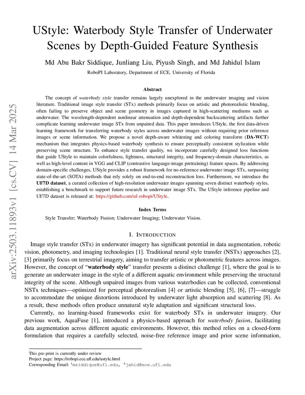 UStyle: Waterbody Style Transfer of Underwater Scenes by Depth-Guided Feature Synthesis
