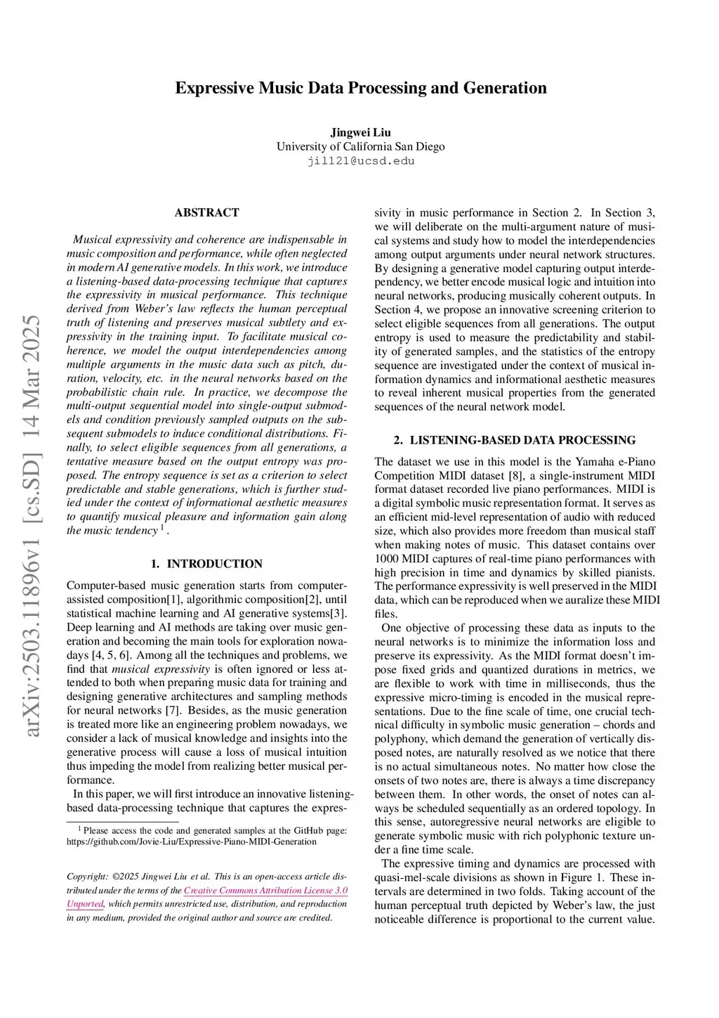 Musical expressivity and coherence are indispensable in music composition and performance, while often neglected in modern AI generative models. In this work, we introduce a listening-based data-processing technique that captures the expressivity in musical performance. This technique derived from Weber's law reflects the human perceptual truth of listening and preserves musical subtlety and expressivity in the training input. To facilitate musical coherence, we model the output interdependencies among multiple arguments in the music data such as pitch, duration, velocity, etc. in the neural networks based on the probabilistic chain rule. In practice, we decompose the multi-output sequential model into single-output submodels and condition previously sampled outputs on the subsequent submodels to induce conditional distributions. Finally, to select eligible sequences from all generations, a tentative measure based on the output entropy was proposed. The entropy sequence is set as a criterion to select predictable and stable generations, which is further studied under the context of informational aesthetic measures to quantify musical pleasure and information gain along the music tendency.