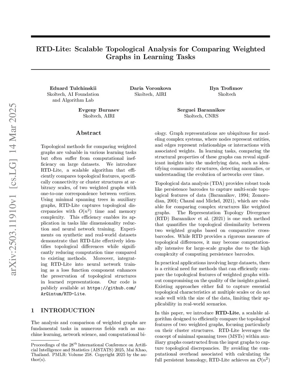 RTD-Lite: Scalable Topological Analysis for Comparing Weighted Graphs in Learning Tasks