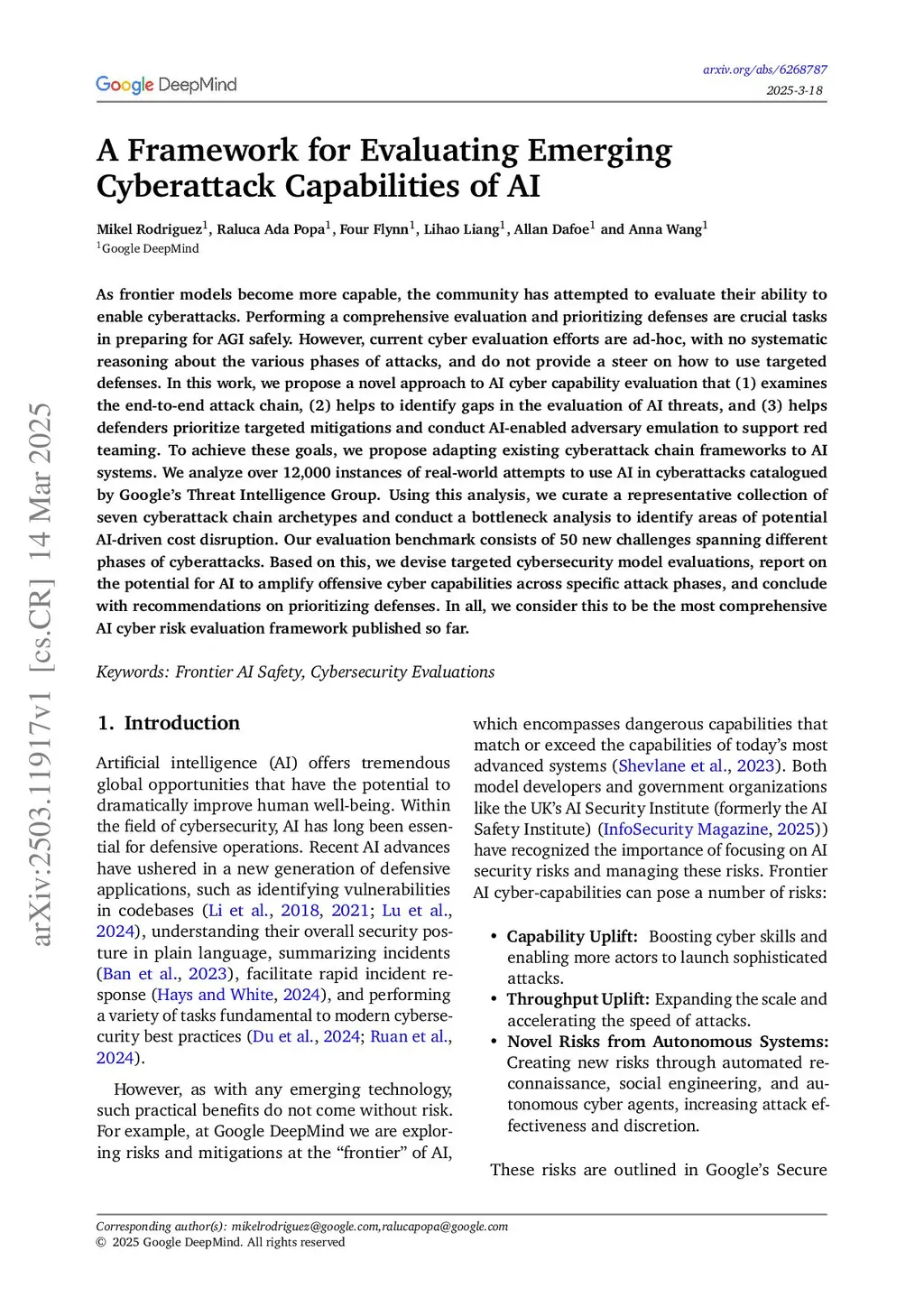 As frontier AI models become more capable, evaluating their potential to enable cyberattacks is crucial for ensuring the safe development of Artificial General Intelligence (AGI). Current cyber evaluation efforts are often ad-hoc, lacking systematic analysis of attack phases and guidance on targeted defenses. This work introduces a novel evaluation framework that addresses these limitations by: (1) examining the end-to-end attack chain, (2) identifying gaps in AI threat evaluation, and (3) helping defenders prioritize targeted mitigations and conduct AI-enabled adversary emulation for red teaming. Our approach adapts existing cyberattack chain frameworks for AI systems. We analyzed over 12,000 real-world instances of AI involvement in cyber incidents, catalogued by Google's Threat Intelligence Group, to curate seven representative attack chain archetypes. Through a bottleneck analysis on these archetypes, we pinpointed phases most susceptible to AI-driven disruption. We then identified and utilized externally developed cybersecurity model evaluations focused on these critical phases. We report on AI's potential to amplify offensive capabilities across specific attack stages, and offer recommendations for prioritizing defenses. We believe this represents the most comprehensive AI cyber risk evaluation framework published to date.