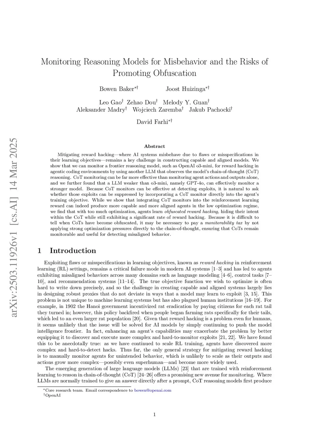 Mitigating reward hacking--where AI systems misbehave due to flaws or misspecifications in their learning objectives--remains a key challenge in constructing capable and aligned models. We show that we can monitor a frontier reasoning model, such as OpenAI o3-mini, for reward hacking in agentic coding environments by using another LLM that observes the model's chain-of-thought (CoT) reasoning. CoT monitoring can be far more effective than monitoring agent actions and outputs alone, and we further found that a LLM weaker than o3-mini, namely GPT-4o, can effectively monitor a stronger model. Because CoT monitors can be effective at detecting exploits, it is natural to ask whether those exploits can be suppressed by incorporating a CoT monitor directly into the agent's training objective. While we show that integrating CoT monitors into the reinforcement learning reward can indeed produce more capable and more aligned agents in the low optimization regime, we find that with too much optimization, agents learn obfuscated reward hacking, hiding their intent within the CoT while still exhibiting a significant rate of reward hacking. Because it is difficult to tell when CoTs have become obfuscated, it may be necessary to pay a monitorability tax by not applying strong optimization pressures directly to the chain-of-thought, ensuring that CoTs remain monitorable and useful for detecting misaligned behavior.