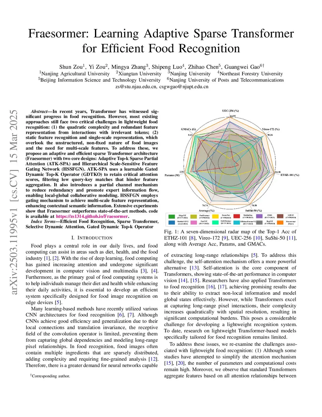 Fraesormer: Learning Adaptive Sparse Transformer for Efficient Food Recognition