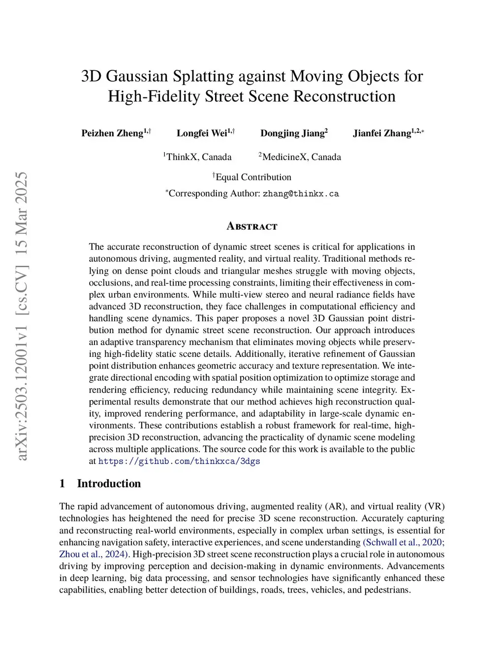The accurate reconstruction of dynamic street scenes is critical for applications in autonomous driving, augmented reality, and virtual reality. Traditional methods relying on dense point clouds and triangular meshes struggle with moving objects, occlusions, and real-time processing constraints, limiting their effectiveness in complex urban environments. While multi-view stereo and neural radiance fields have advanced 3D reconstruction, they face challenges in computational efficiency and handling scene dynamics. This paper proposes a novel 3D Gaussian point distribution method for dynamic street scene reconstruction. Our approach introduces an adaptive transparency mechanism that eliminates moving objects while preserving high-fidelity static scene details. Additionally, iterative refinement of Gaussian point distribution enhances geometric accuracy and texture representation. We integrate directional encoding with spatial position optimization to optimize storage and rendering efficiency, reducing redundancy while maintaining scene integrity. Experimental results demonstrate that our method achieves high reconstruction quality, improved rendering performance, and adaptability in large-scale dynamic environments. These contributions establish a robust framework for real-time, high-precision 3D reconstruction, advancing the practicality of dynamic scene modeling across multiple applications.