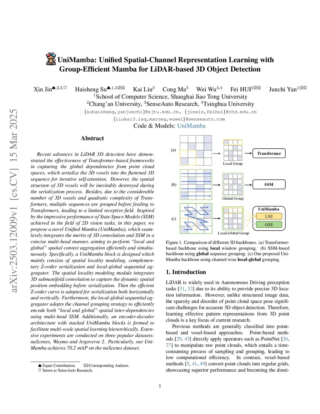 UniMamba: Unified Spatial-Channel Representation Learning with Group-Efficient Mamba for LiDAR-based 3D Object Detection