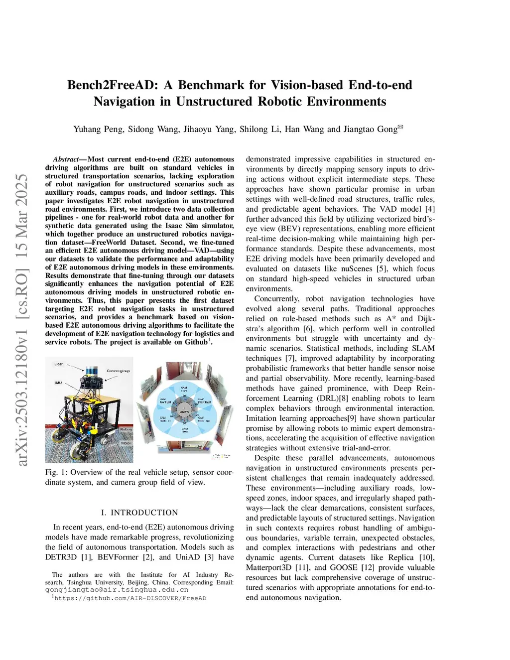 Most current end-to-end (E2E) autonomous driving algorithms are built on standard vehicles in structured transportation scenarios, lacking exploration of robot navigation for unstructured scenarios such as auxiliary roads, campus roads, and indoor settings. This paper investigates E2E robot navigation in unstructured road environments. First, we introduce two data collection pipelines - one for real-world robot data and another for synthetic data generated using the Isaac Sim simulator, which together produce an unstructured robotics navigation dataset -- FreeWorld Dataset. Second, we fine-tuned an efficient E2E autonomous driving model -- VAD -- using our datasets to validate the performance and adaptability of E2E autonomous driving models in these environments. Results demonstrate that fine-tuning through our datasets significantly enhances the navigation potential of E2E autonomous driving models in unstructured robotic environments. Thus, this paper presents the first dataset targeting E2E robot navigation tasks in unstructured scenarios, and provides a benchmark based on vision-based E2E autonomous driving algorithms to facilitate the development of E2E navigation technology for logistics and service robots. The project is available on Github.