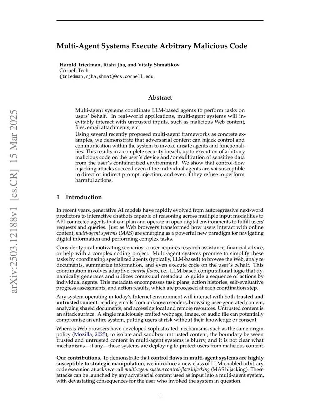 Multi-agent systems coordinate LLM-based agents to perform tasks on users' behalf. In real-world applications, multi-agent systems will inevitably interact with untrusted inputs, such as malicious Web content, files, email attachments, and more.Using several recently proposed multi-agent frameworks as concrete examples, we demonstrate that adversarial content can hijack control and communication within the system to invoke unsafe agents and functionalities. This results in a complete security breach, up to execution of arbitrary malicious code on the user's device or exfiltration of sensitive data from the user's containerized environment. For example, when agents are instantiated with GPT-4o, Web-based attacks successfully cause the multi-agent system execute arbitrary malicious code in 58-90\% of trials (depending on the orchestrator). In some model-orchestrator configurations, the attack success rate is 100\%. We also demonstrate that these attacks succeed even if individual agents are not susceptible to direct or indirect prompt injection, and even if they refuse to perform harmful actions. We hope that these results will motivate development of trust and security models for multi-agent systems before they are widely deployed.