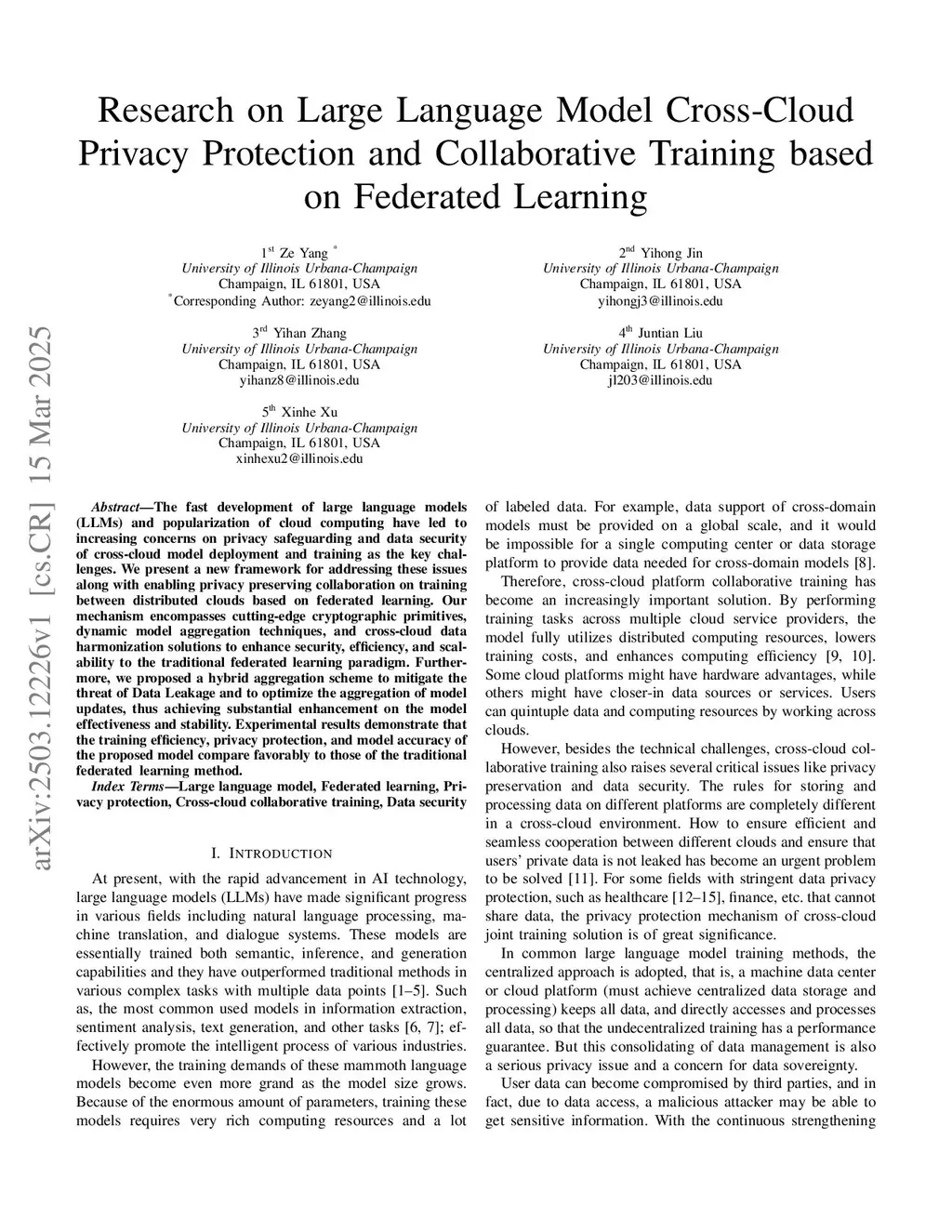 The fast development of large language models (LLMs) and popularization of cloud computing have led to increasing concerns on privacy safeguarding and data security of cross-cloud model deployment and training as the key challenges. We present a new framework for addressing these issues along with enabling privacy preserving collaboration on training between distributed clouds based on federated learning. Our mechanism encompasses cutting-edge cryptographic primitives, dynamic model aggregation techniques, and cross-cloud data harmonization solutions to enhance security, efficiency, and scalability to the traditional federated learning paradigm. Furthermore, we proposed a hybrid aggregation scheme to mitigate the threat of Data Leakage and to optimize the aggregation of model updates, thus achieving substantial enhancement on the model effectiveness and stability. Experimental results demonstrate that the training efficiency, privacy protection, and model accuracy of the proposed model compare favorably to those of the traditional federated learning method.