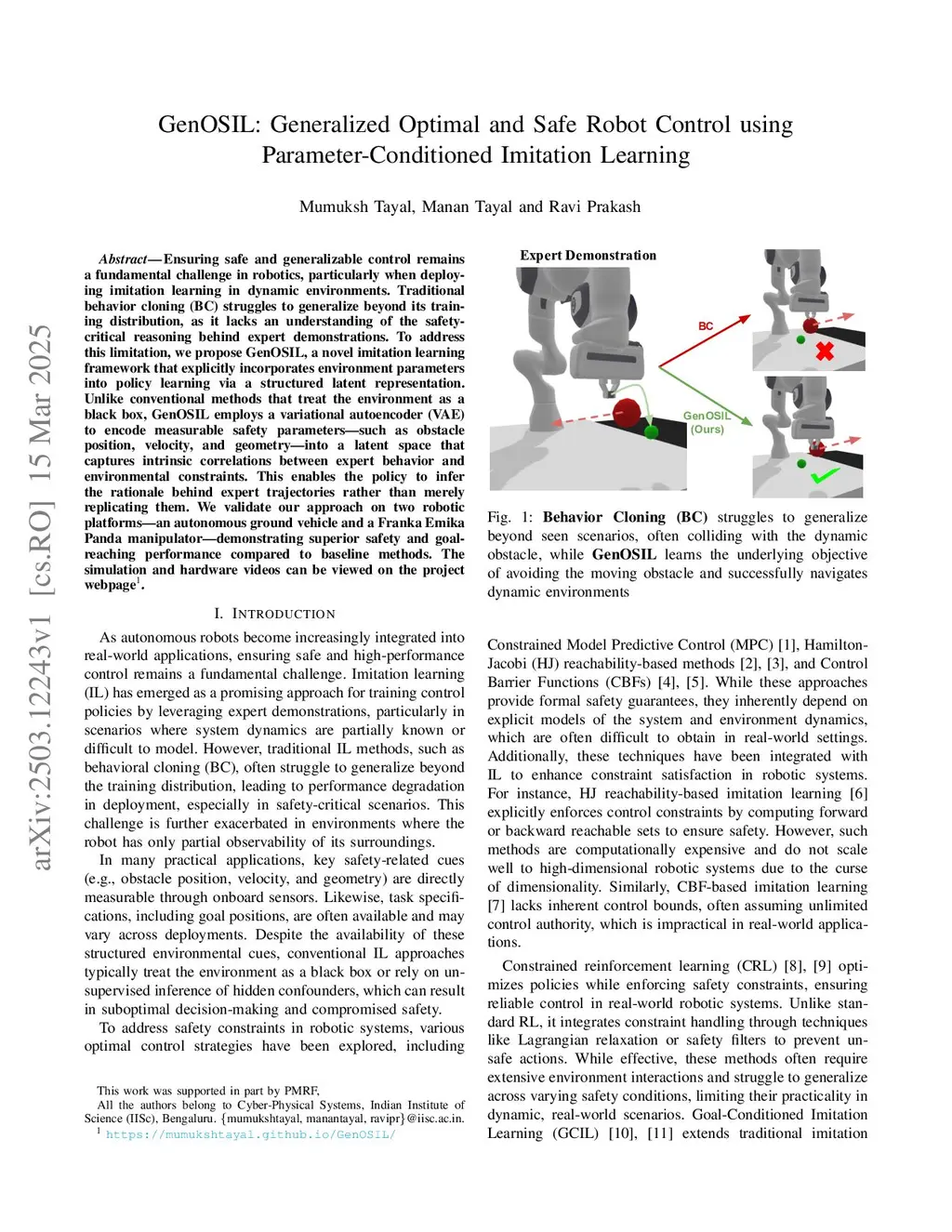 Ensuring safety in robotic systems remains a fundamental challenge, especially when deploying offline policy-learning methods such as imitation learning in dynamic environments. Traditional behavior cloning (BC) often fails to generalize when deployed without fine-tuning as it does not account for disturbances in observations that arises in real-world, changing environments. To address this limitation, we propose RISE (Robust Imitation through Stochastic Encodings), a novel imitation-learning framework that explicitly addresses erroneous measurements of environment parameters into policy learning via a variational latent representation. Our framework encodes parameters such as obstacle state, orientation, and velocity into a smooth variational latent space to improve test time generalization. This enables an offline-trained policy to produce actions that are more robust to perceptual noise and environment uncertainty. We validate our approach on two robotic platforms, an autonomous ground vehicle and a Franka Emika Panda manipulator and demonstrate improved safety robustness while maintaining goal-reaching performance compared to baseline methods.