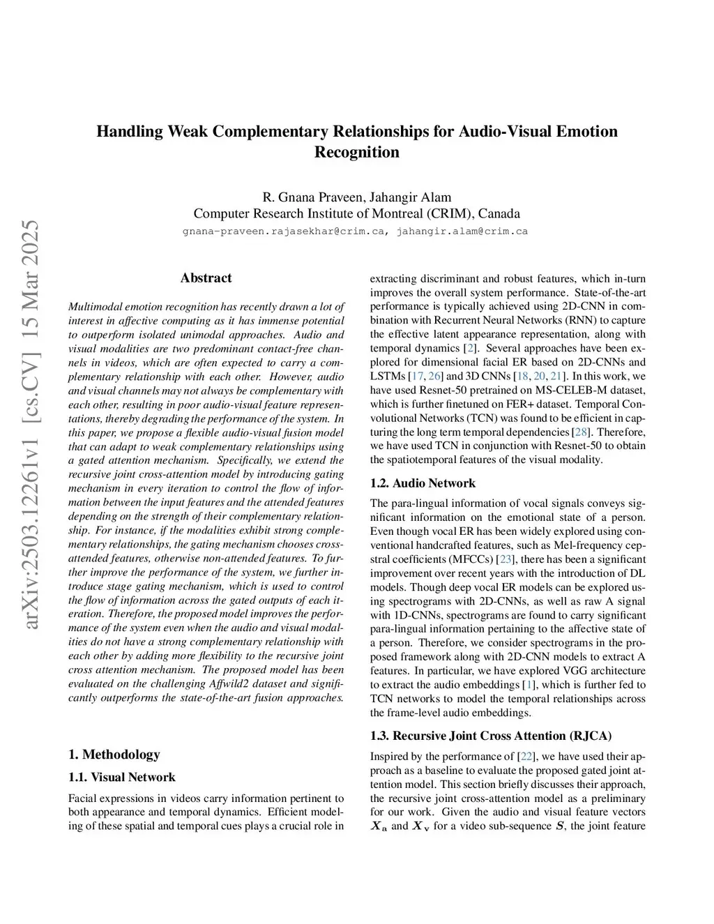 Audio and visual modalities are two predominant contact-free channels in videos, which are often expected to carry a complementary relationship with each other. However, they may not always complement each other, resulting in poor audio-visual feature representations. In this paper, we introduce Gated Recursive Joint Cross Attention (GRJCA) using a gating mechanism that can adaptively choose the most relevant features to effectively capture the synergic relationships across audio and visual modalities. Specifically, we improve the performance of Recursive Joint Cross-Attention (RJCA) by introducing a gating mechanism to control the flow of information between the input features and the attended features of multiple iterations depending on the strength of their complementary relationship. For instance, if the modalities exhibit strong complementary relationships, the gating mechanism emphasizes cross-attended features, otherwise non-attended features. To further improve the performance of the system, we also explored a hierarchical gating approach by introducing a gating mechanism at every iteration, followed by high-level gating across the gated outputs of each iteration. The proposed approach improves the performance of RJCA model by adding more flexibility to deal with weak complementary relationships across audio and visual modalities. Extensive experiments are conducted on the challenging Affwild2 dataset to demonstrate the robustness of the proposed approach. By effectively handling the weak complementary relationships across the audio and visual modalities, the proposed model achieves a Concordance Correlation Coefficient (CCC) of 0.561 (0.623) and 0.620 (0.660) for valence and arousal respectively on the test set (validation set).