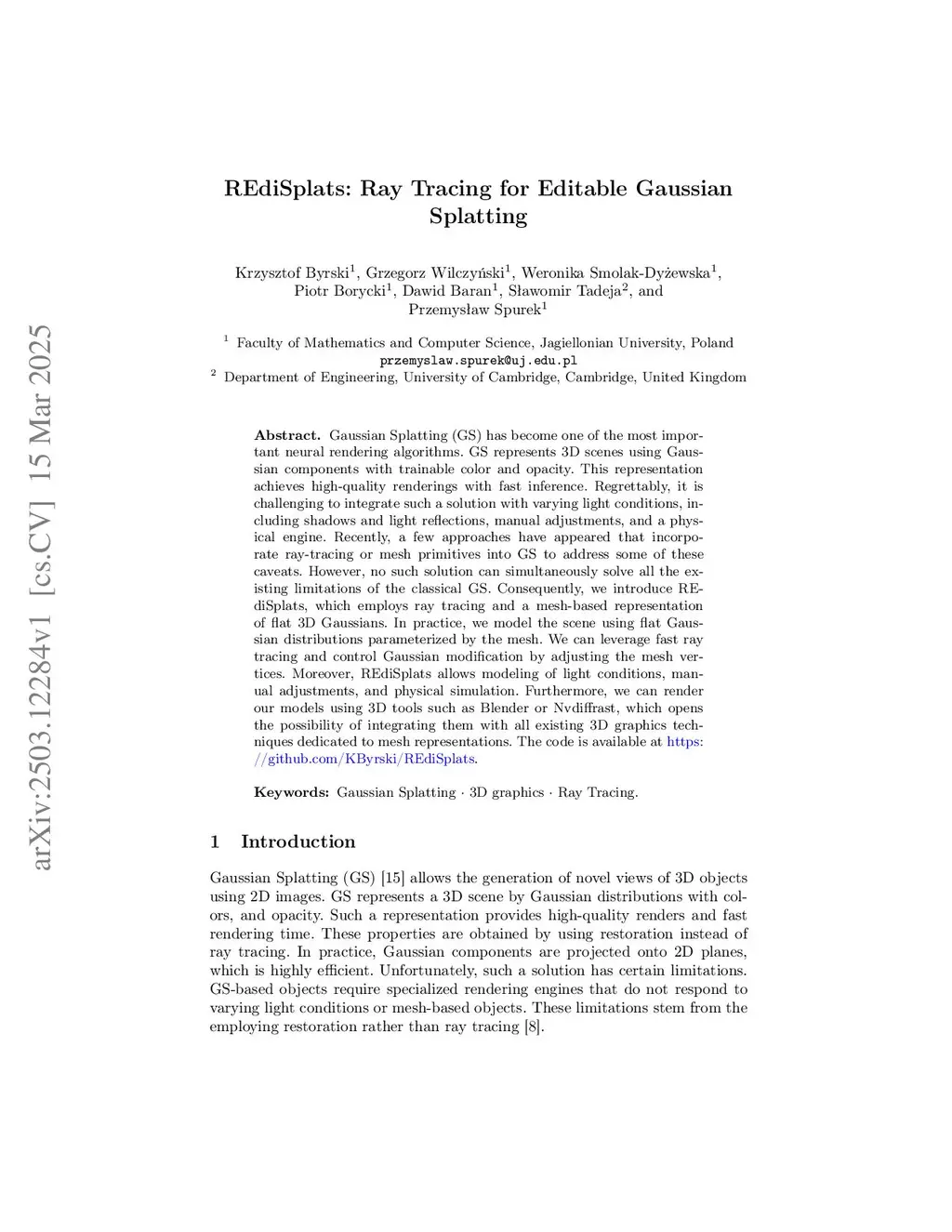 Gaussian Splatting (GS) has become one of the most important neural rendering algorithms. GS represents 3D scenes using Gaussian components with trainable color and opacity. This representation achieves high-quality renderings with fast inference. Regrettably, it is challenging to integrate such a solution with varying light conditions, including shadows and light reflections, manual adjustments, and a physical engine. Recently, a few approaches have appeared that incorporate ray-tracing or mesh primitives into GS to address some of these caveats. However, no such solution can simultaneously solve all the existing limitations of the classical GS. Consequently, we introduce REdiSplats, which employs ray tracing and a mesh-based representation of flat 3D Gaussians. In practice, we model the scene using flat Gaussian distributions parameterized by the mesh. We can leverage fast ray tracing and control Gaussian modification by adjusting the mesh vertices. Moreover, REdiSplats allows modeling of light conditions, manual adjustments, and physical simulation. Furthermore, we can render our models using 3D tools such as Blender or Nvdiffrast, which opens the possibility of integrating them with all existing 3D graphics techniques dedicated to mesh representations.