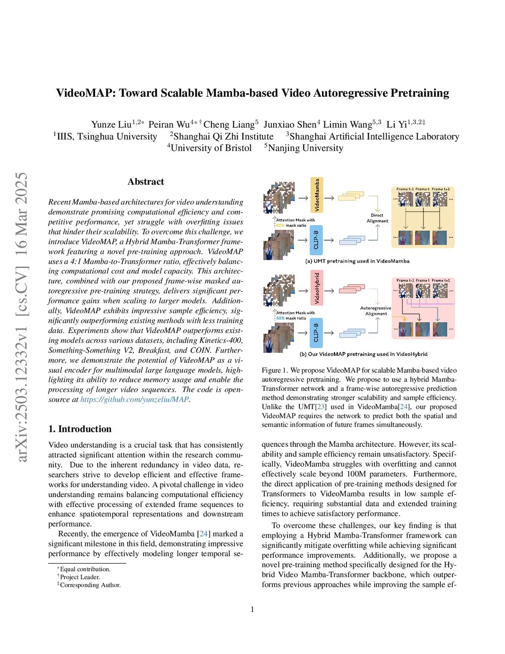 Recent Mamba-based architectures for video understanding demonstrate promising computational efficiency and competitive performance, yet struggle with overfitting issues that hinder their scalability. To overcome this challenge, we introduce VideoMAP, a Hybrid Mamba-Transformer framework featuring a novel pre-training approach. VideoMAP uses a 4:1 Mamba-to-Transformer ratio, effectively balancing computational cost and model capacity. This architecture, combined with our proposed frame-wise masked autoregressive pre-training strategy, delivers significant performance gains when scaling to larger models. Additionally, VideoMAP exhibits impressive sample efficiency, significantly outperforming existing methods with less training data. Experiments show that VideoMAP outperforms existing models across various datasets, including Kinetics-400, Something-Something V2, Breakfast, and COIN. Furthermore, we demonstrate the potential of VideoMAP as a visual encoder for multimodal large language models, highlighting its ability to reduce memory usage and enable the processing of longer video sequences. The code is open-source atthis https URL
