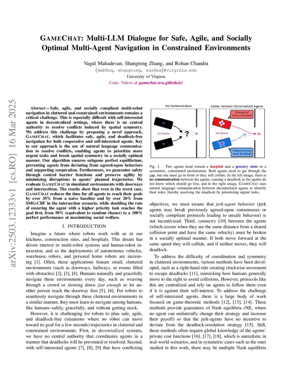 Safe, agile, and socially compliant multi-robot navigation in cluttered and constrained environments remains a critical challenge. This is especially difficult with self-interested agents in decentralized settings, where there is no central authority to resolve conflicts induced by spatial symmetry. We address this challenge by proposing a novel approach, GameChat, which facilitates safe, agile, and deadlock-free navigation for both cooperative and self-interested agents. Key to our approach is the use of natural language communication to resolve conflicts, enabling agents to prioritize more urgent tasks and break spatial symmetry in a socially optimal manner. Our algorithm ensures subgame perfect equilibrium, preventing agents from deviating from agreed-upon behaviors and supporting cooperation. Furthermore, we guarantee safety through control barrier functions and preserve agility by minimizing disruptions to agents' planned trajectories. We evaluate GameChat in simulated environments with doorways and intersections. The results show that even in the worst case, GameChat reduces the time for all agents to reach their goals by over 35% from a naive baseline and by over 20% from SMG-CBF in the intersection scenario, while doubling the rate of ensuring the agent with a higher priority task reaches the goal first, from 50% (equivalent to random chance) to a 100% perfect performance at maximizing social welfare.