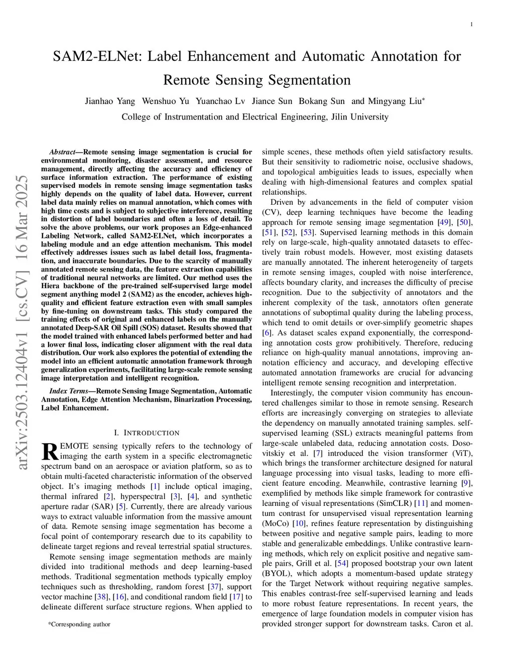 Remote sensing image segmentation is crucial for environmental monitoring, disaster assessment, and resource management, but its performance largely depends on the quality of the dataset. Although several high-quality datasets are broadly accessible, data scarcity remains for specialized tasks like marine oil spill segmentation. Such tasks still rely on manual annotation, which is both time-consuming and influenced by subjective human factors. The segment anything model 2 (SAM2) has strong potential as an automatic annotation framework but struggles to perform effectively on heterogeneous, low-contrast remote sensing imagery. To address these challenges, we introduce a novel label enhancement and automatic annotation framework, termed SAM2-ELNet (Enhancement and Labeling Network). Specifically, we employ the frozen Hiera backbone from the pretrained SAM2 as the encoder, while fine-tuning the adapter and decoder for different remote sensing tasks. In addition, the proposed framework includes a label quality evaluator for filtering, ensuring the reliability of the generated labels. We design a series of experiments targeting resource-limited remote sensing tasks and evaluate our method on two datasets: the Deep-SAR Oil Spill (SOS) dataset with Synthetic Aperture Radar (SAR) imagery, and the CHN6-CUG Road dataset with Very High Resolution (VHR) optical imagery. The proposed framework can enhance coarse annotations and generate reliable training data under resource-limited conditions. Fine-tuned on only 30% of the training data, it generates automatically labeled data. A model trained solely on these achieves slightly lower performance than using the full original annotations, while greatly reducing labeling costs and offering a practical solution for large-scale remote sensing interpretation.