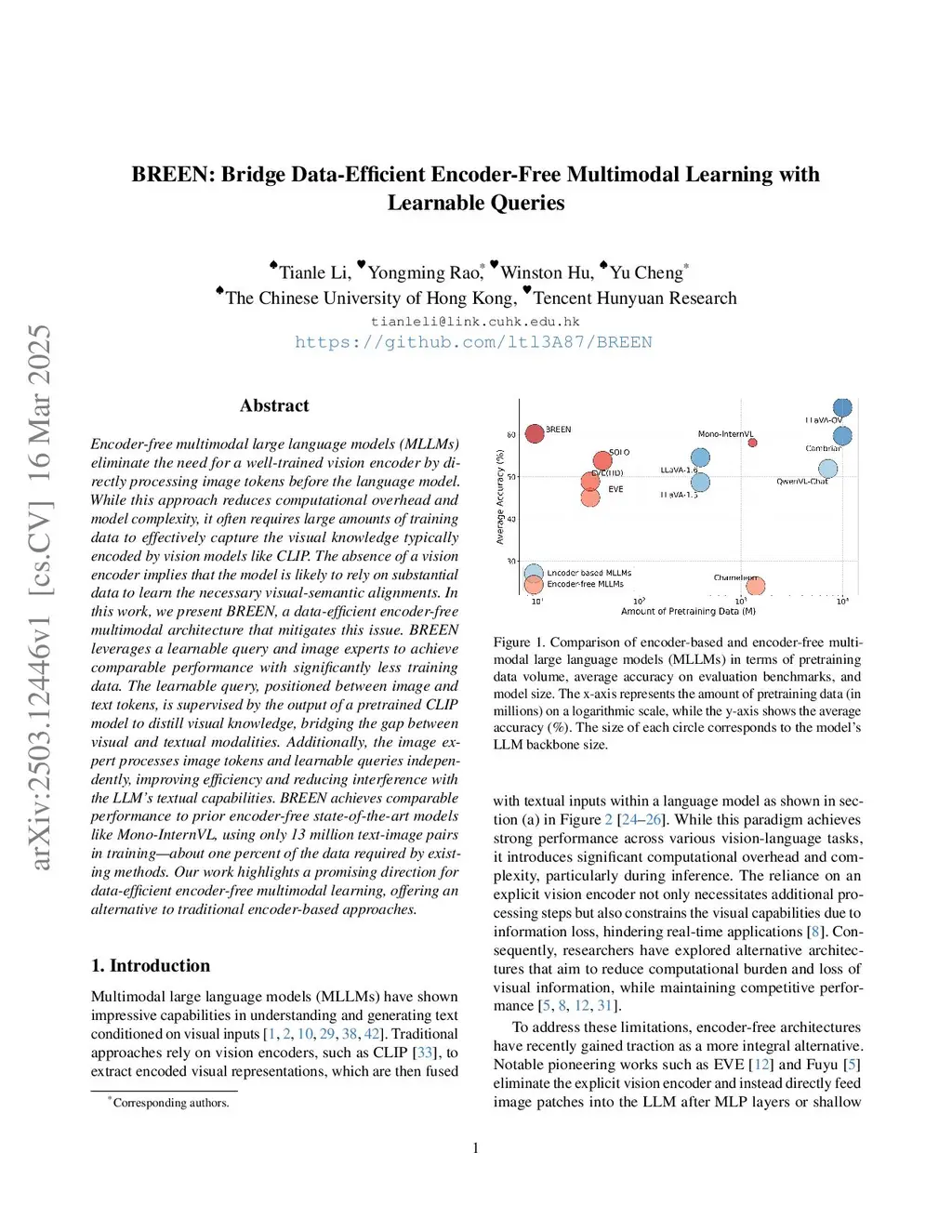 BREEN: Bridge Data-Efficient Encoder-Free Multimodal Learning with Learnable Queries