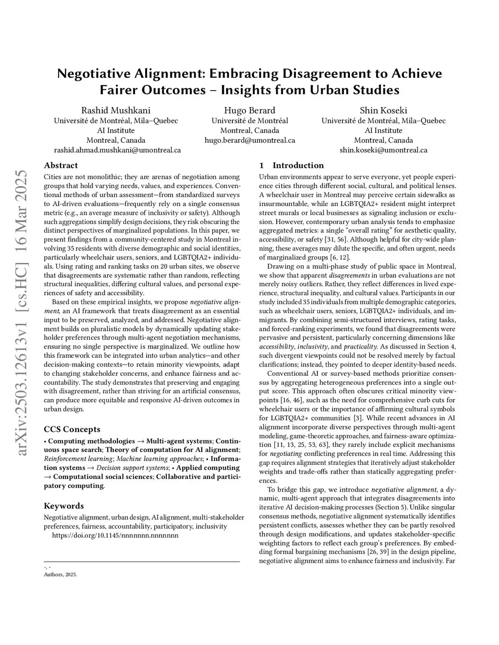 Urban assessments often compress diverse needs into single scores, which can obscure minority perspectives. We present a community-centered study in Montreal (n=35; wheelchair users, seniors, LGBTQIA2+ residents, and immigrants). Participants rated 20 streets (accessibility, inclusivity, aesthetics, practicality) and ranked 7 images on 12 interview-elicited criteria. Disagreement patterns were systematic in our sample: wheelchair users diverged most on accessibility and practicality; LGBTQIA2+ participants emphasized inclusion and liveliness; seniors prioritized security. Group discussion reduced information gaps but not value conflicts; ratings conveyed intensity, while rankings forced trade-offs. We then formalize negotiative alignment, a transparent, budget-aware bargaining procedure, and pilot it with role-played stakeholder agents plus a neutral mediator. Relative to the best base design under the same public rubric, the negotiated package increased total utility (21.10 to 24.55), raised the worst-group utility (3.20 to 3.90), improved twentieth percentile satisfaction (0.86 to 1.00; min-max normalized within the scenario), and reduced inequality (Gini 0.036 to 0.025). Treating disagreement as signal and reporting worst-group outcomes alongside totals may help planners and AI practitioners surface trade-offs and preserve minority priorities while maintaining efficiency.