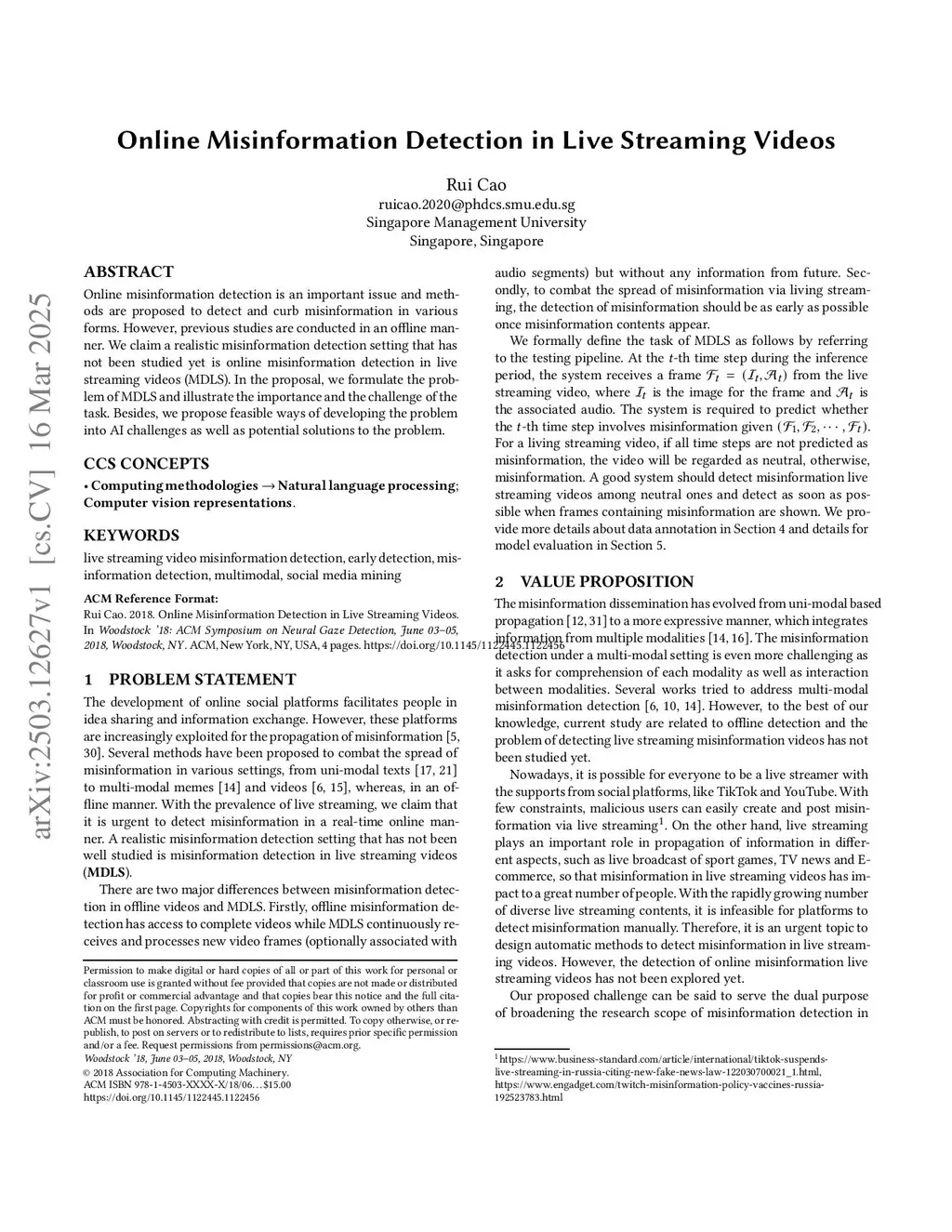 Online misinformation detection is an important issue and methods are proposed to detect and curb misinformation in various forms. However, previous studies are conducted in an offline manner. We claim a realistic misinformation detection setting that has not been studied yet is online misinformation detection in live streaming videos (MDLS). In the proposal, we formulate the problem of MDLS and illustrate the importance and the challenge of the task. Besides, we propose feasible ways of developing the problem into AI challenges as well as potential solutions to the problem.