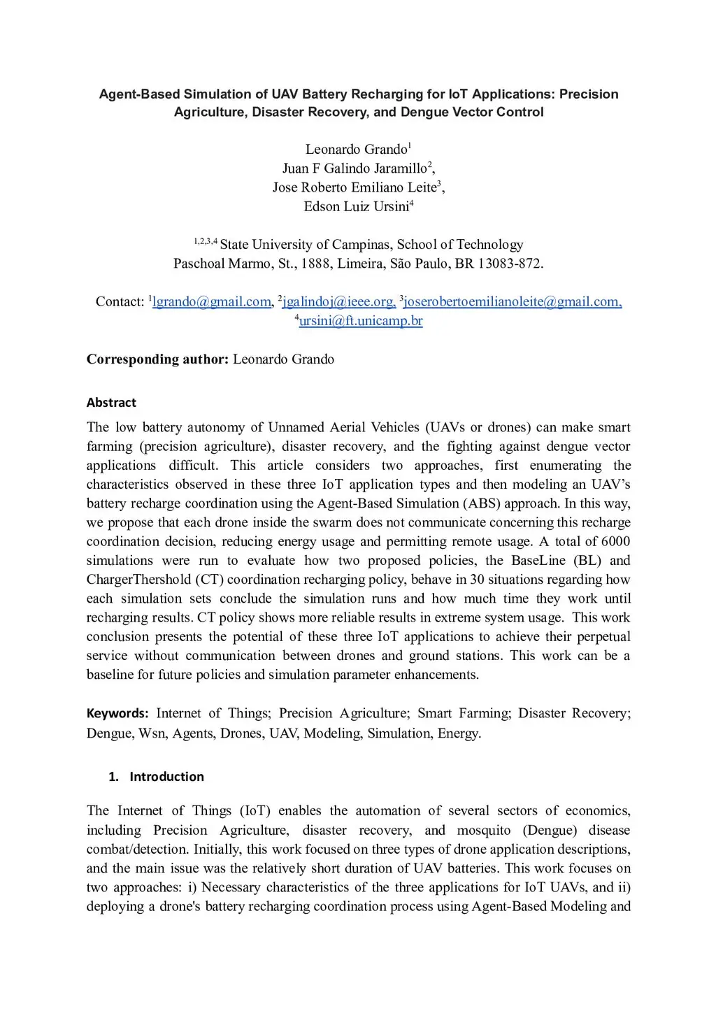Agent-Based Simulation of UAV Battery Recharging for IoT Applications: Precision Agriculture, Disaster Recovery, and Dengue Vector Control
