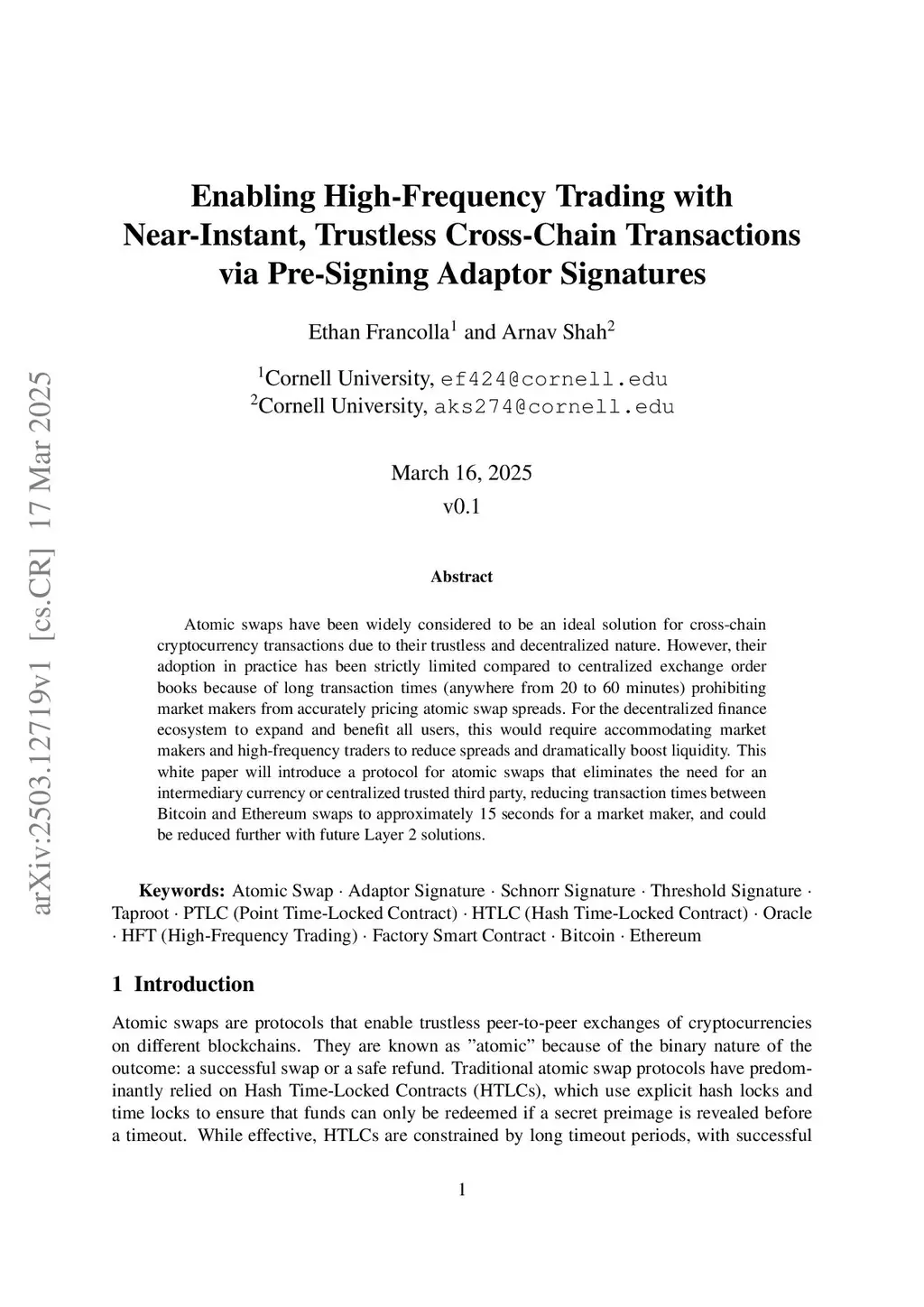 Atomic swaps have been widely considered to be an ideal solution for cross-chain cryptocurrency transactions due to their trustless and decentralized nature. However, their adoption in practice has been strictly limited compared to centralized exchange order books because of long transaction times (anywhere from 20 to 60 minutes) prohibiting market makers from accurately pricing atomic swap spreads. For the decentralized finance ecosystem to expand and benefit all users, this would require accommodating market makers and high-frequency traders to reduce spreads and dramatically boost liquidity. This white paper will introduce a protocol for atomic swaps that eliminates the need for an intermediary currency or centralized trusted third party, reducing transaction times between Bitcoin and Ethereum swaps to approximately 15 seconds for a market maker, and could be reduced further with future Layer 2 solutions.