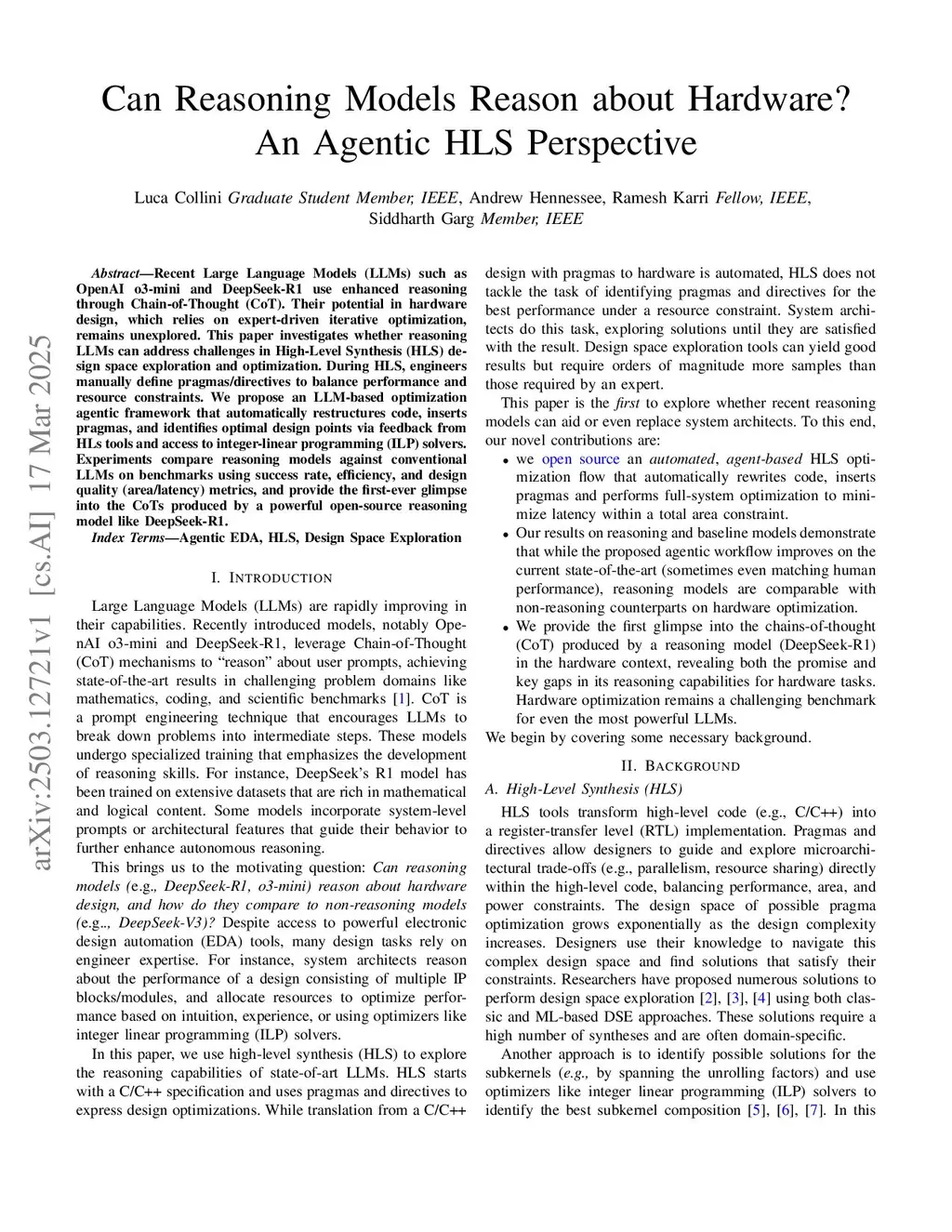 Recent Large Language Models (LLMs) such as OpenAI o3-mini and DeepSeek-R1 use enhanced reasoning through Chain-of-Thought (CoT). Their potential in hardware design, which relies on expert-driven iterative optimization, remains unexplored. This paper investigates whether reasoning LLMs can address challenges in High-Level Synthesis (HLS) design space exploration and optimization. During HLS, engineers manually define pragmas/directives to balance performance and resource constraints. We propose an LLM-based optimization agentic framework that automatically restructures code, inserts pragmas, and identifies optimal design points via feedback from HLs tools and access to integer-linear programming (ILP) solvers. Experiments compare reasoning models against conventional LLMs on benchmarks using success rate, efficiency, and design quality (area/latency) metrics, and provide the first-ever glimpse into the CoTs produced by a powerful open-source reasoning model like DeepSeek-R1.