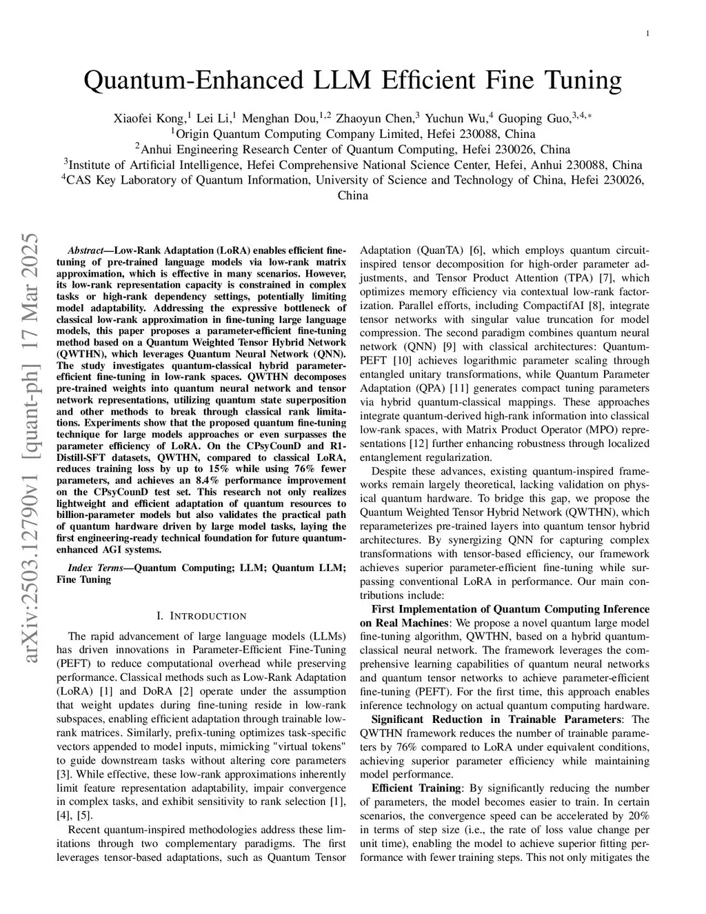 Low-Rank Adaptation (LoRA) enables efficient fine-tuning of pre-trained language models through low-rank matrix approximation, achieving effectiveness in many scenarios. However, its representation capacity is constrained in complex tasks or high-rank dependency settings, potentially limiting model adaptability. To overcome the expressive bottleneck in classical low-rank approximation for fine-tuning large language models (LLMs), we propose Quantum Tensor Hybrid Adaptation (QTHA), a parameter-efficient fine-tuning method that integrates a quantum neural network (QNN) with a tensor network. QTHA explores quantum tensor hybrid fine-tuning within low-rank spaces by decomposing pre-trained weights into quantum neural network and tensor network representations, leveraging quantum state superposition to overcome classical rank limitations. Experiments demonstrate that QTHA achieves performance comparable to or surpassing LoRA in parameter-efficient fine-tuning. Compared to LoRA, QTHA reduces trainable parameters by 76% while reducing training loss by up to 17% and improving test set performance by up to 17% within the same training steps. This research not only enables lightweight adaptation of quantum resources to the billion-parameter models but also validates the feasibility of quantum hardware optimization driven by LLM tasks. It establishes the first engineering-ready foundation for future quantum-enhanced Artificial General Intelligence (AGI) systems.