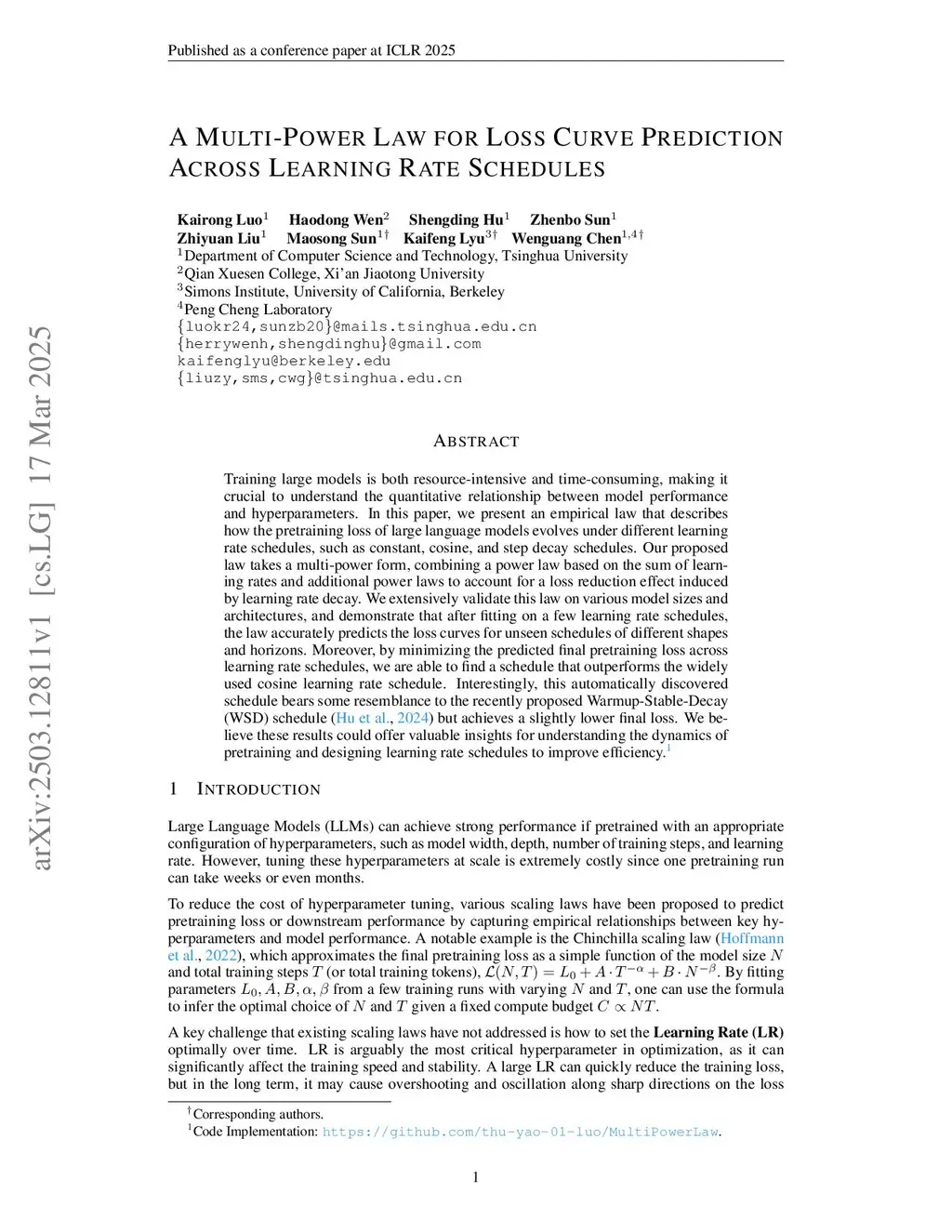 Training large models is both resource-intensive and time-consuming, making it crucial to understand the quantitative relationship between model performance and hyperparameters. In this paper, we present an empirical law that describes how the pretraining loss of large language models evolves under different learning rate schedules, such as constant, cosine, and step decay schedules. Our proposed law takes a multi-power form, combining a power law based on the sum of learning rates and additional power laws to account for a loss reduction effect induced by learning rate decay. We extensively validate this law on various model sizes and architectures, and demonstrate that after fitting on a few learning rate schedules, the law accurately predicts the loss curves for unseen schedules of different shapes and horizons. Moreover, by minimizing the predicted final pretraining loss across learning rate schedules, we are able to find a schedule that outperforms the widely used cosine learning rate schedule. Interestingly, this automatically discovered schedule bears some resemblance to the recently proposed Warmup-Stable-Decay (WSD) schedule (Hu et al, 2024) but achieves a slightly lower final loss. We believe these results could offer valuable insights for understanding the dynamics of pretraining and designing learning rate schedules to improve efficiency.