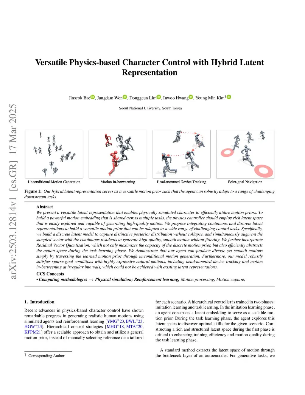 We present a versatile latent representation that enables physically simulated character to efficiently utilize motion priors. To build a powerful motion embedding that is shared across multiple tasks, the physics controller should employ rich latent space that is easily explored and capable of generating high-quality motion. We propose integrating continuous and discrete latent representations to build a versatile motion prior that can be adapted to a wide range of challenging control tasks. Specifically, we build a discrete latent model to capture distinctive posterior distribution without collapse, and simultaneously augment the sampled vector with the continuous residuals to generate high-quality, smooth motion without jittering. We further incorporate Residual Vector Quantization, which not only maximizes the capacity of the discrete motion prior, but also efficiently abstracts the action space during the task learning phase. We demonstrate that our agent can produce diverse yet smooth motions simply by traversing the learned motion prior through unconditional motion generation. Furthermore, our model robustly satisfies sparse goal conditions with highly expressive natural motions, including head-mounted device tracking and motion in-betweening at irregular intervals, which could not be achieved with existing latent representations.