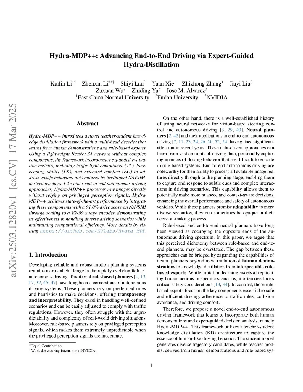 Hydra-MDP++ introduces a novel teacher-student knowledge distillation framework with a multi-head decoder that learns from human demonstrations and rule-based experts. Using a lightweight ResNet-34 network without complex components, the framework incorporates expanded evaluation metrics, including traffic light compliance (TL), lane-keeping ability (LK), and extended comfort (EC) to address unsafe behaviors not captured by traditional NAVSIM-derived teachers. Like other end-to-end autonomous driving approaches, \hydra processes raw images directly without relying on privileged perception signals. Hydra-MDP++ achieves state-of-the-art performance by integrating these components with a 91.0% drive score on NAVSIM through scaling to a V2-99 image encoder, demonstrating its effectiveness in handling diverse driving scenarios while maintaining computational efficiency.