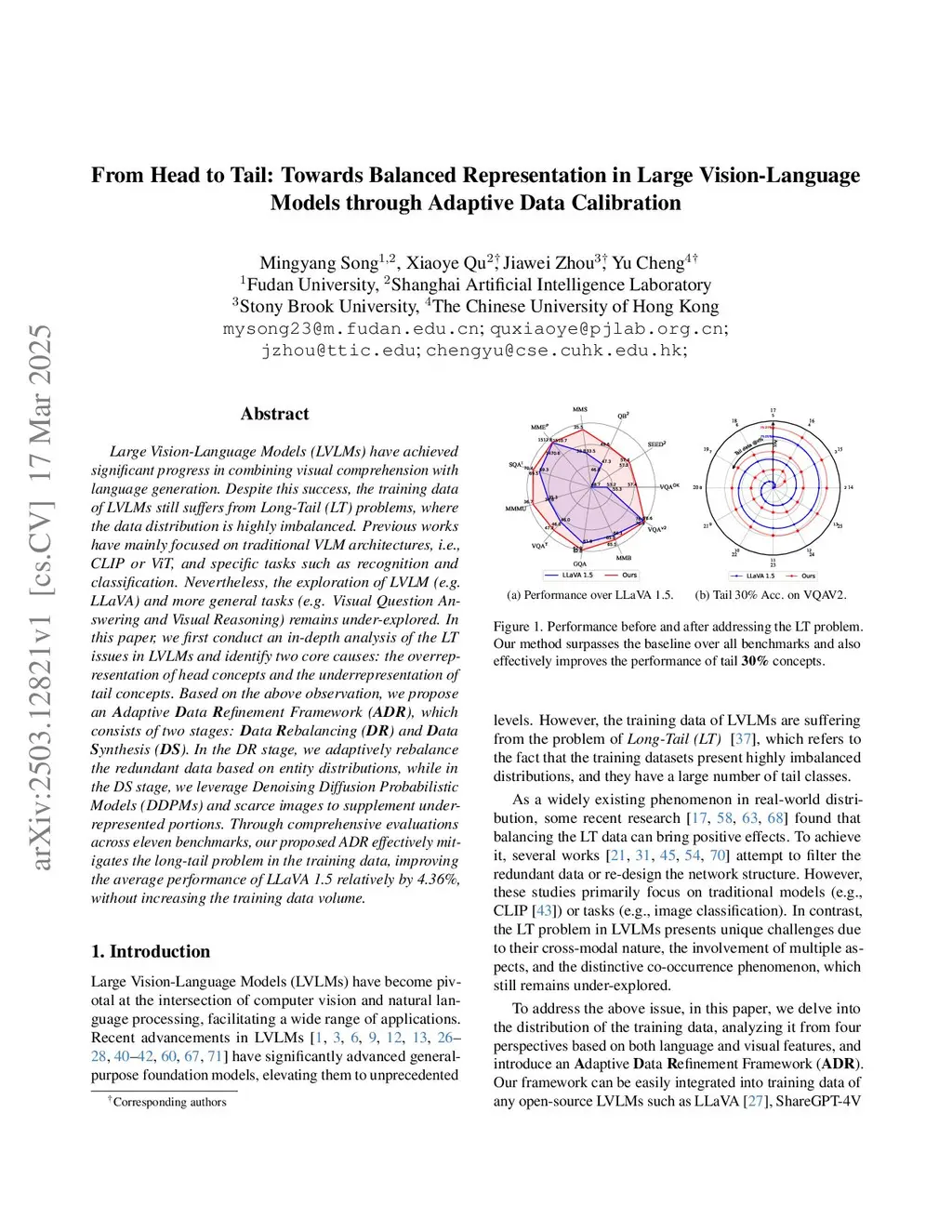 Large Vision-Language Models (LVLMs) have achieved significant progress in combining visual comprehension with language generation. Despite this success, the training data of LVLMs still suffers from Long-Tail (LT) problems, where the data distribution is highly imbalanced. Previous works have mainly focused on traditional VLM architectures, i.e., CLIP or ViT, and specific tasks such as recognition and classification. Nevertheless, the exploration of LVLM (e.g. LLaVA) and more general tasks (e.g. Visual Question Answering and Visual Reasoning) remains under-explored. In this paper, we first conduct an in-depth analysis of the LT issues in LVLMs and identify two core causes: the overrepresentation of head concepts and the underrepresentation of tail concepts. Based on the above observation, we propose an daptive ata efinement Framework (), which consists of two stages: ata ebalancing () and ata ynthesis (). In the DR stage, we adaptively rebalance the redundant data based on entity distributions, while in the DS stage, we leverage Denoising Diffusion Probabilistic Models (DDPMs) and scarce images to supplement underrepresented portions. Through comprehensive evaluations across eleven benchmarks, our proposed ADR effectively mitigates the long-tail problem in the training data, improving the average performance of LLaVA 1.5 relatively by 4.36%, without increasing the training data volume.