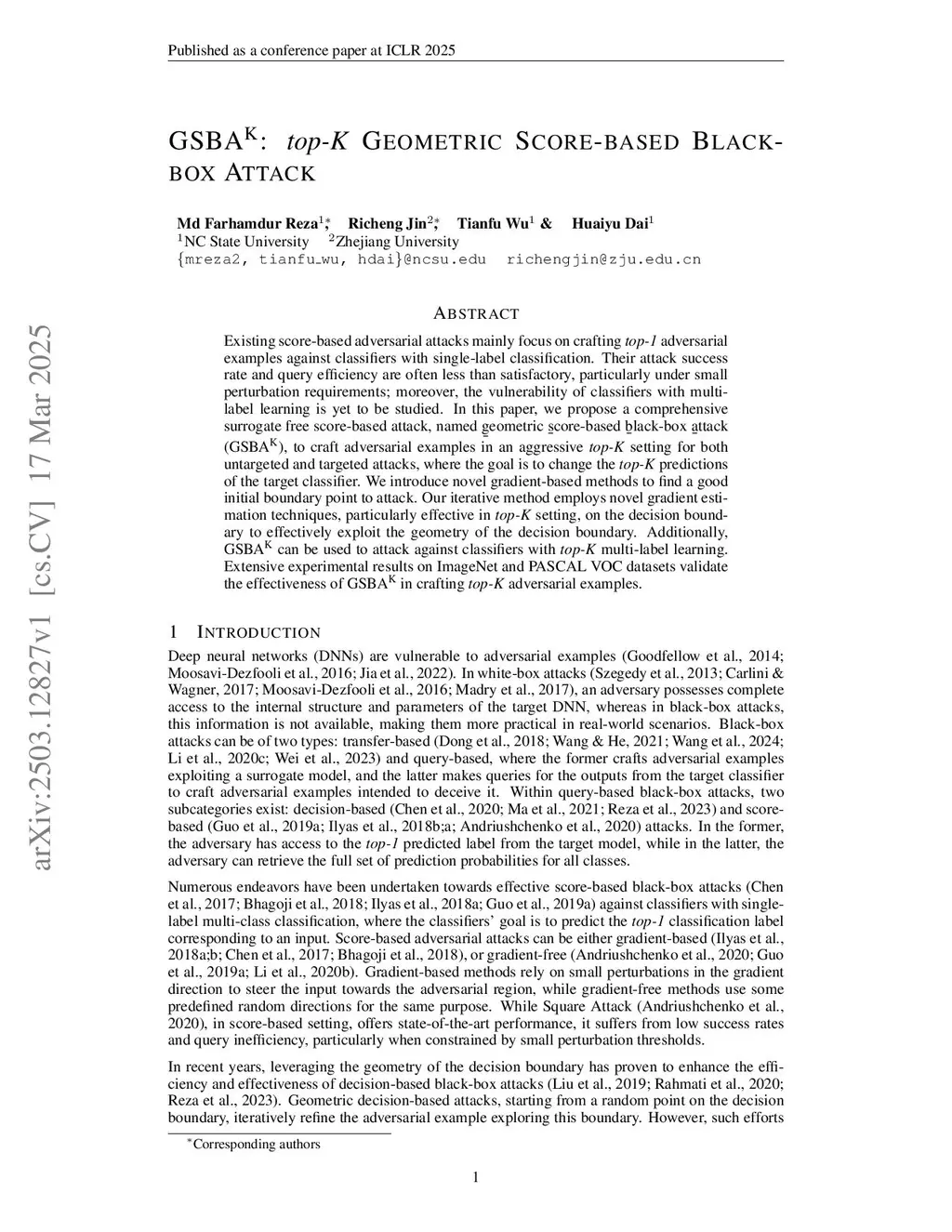 Existing score-based adversarial attacks mainly focus on crafting -1 adversarial examples against classifiers with single-label classification. Their attack success rate and query efficiency are often less than satisfactory, particularly under small perturbation requirements; moreover, the vulnerability of classifiers with multi-label learning is yet to be studied. In this paper, we propose a comprehensive surrogate free score-based attack, named \b geometric \b score-based \b black-box \b attack (GSBA), to craft adversarial examples in an aggressive - setting for both untargeted and targeted attacks, where the goal is to change the - predictions of the target classifier. We introduce novel gradient-based methods to find a good initial boundary point to attack. Our iterative method employs novel gradient estimation techniques, particularly effective in - setting, on the decision boundary to effectively exploit the geometry of the decision boundary. Additionally, GSBA can be used to attack against classifiers with - multi-label learning. Extensive experimental results on ImageNet and PASCAL VOC datasets validate the effectiveness of GSBA in crafting - adversarial examples.