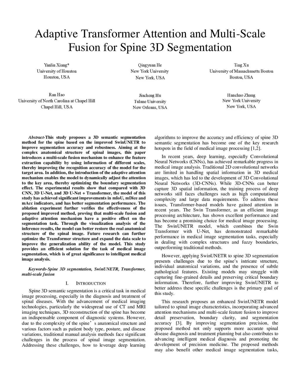 Adaptive Transformer Attention and Multi-Scale Fusion for Spine 3D Segmentation