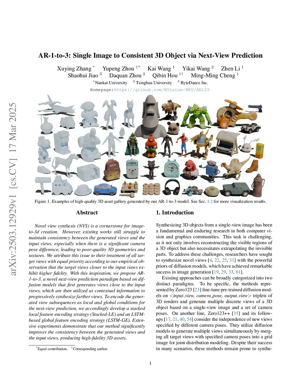 Novel view synthesis (NVS) is a cornerstone for image-to-3d creation. However, existing works still struggle to maintain consistency between the generated views and the input views, especially when there is a significant camera pose difference, leading to poor-quality 3D geometries and textures. We attribute this issue to their treatment of all target views with equal priority according to our empirical observation that the target views closer to the input views exhibit higher fidelity. With this inspiration, we propose AR-1-to-3, a novel next-view prediction paradigm based on diffusion models that first generates views close to the input views, which are then utilized as contextual information to progressively synthesize farther views. To encode the generated view subsequences as local and global conditions for the next-view prediction, we accordingly develop a stacked local feature encoding strategy (Stacked-LE) and an LSTM-based global feature encoding strategy (LSTM-GE). Extensive experiments demonstrate that our method significantly improves the consistency between the generated views and the input views, producing high-fidelity 3D assets.