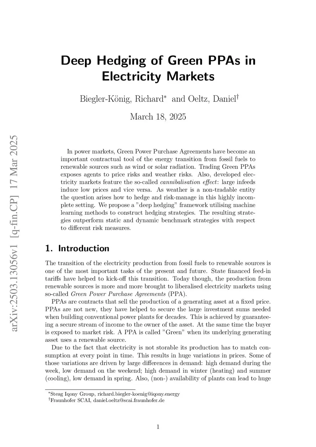 In power markets, Green Power Purchase Agreements have become an important contractual tool of the energy transition from fossil fuels to renewable sources such as wind or solar radiation. Trading Green PPAs exposes agents to price risks and weather risks. Also, developed electricity markets feature the so-called cannibalisation effect : large infeeds induce low prices and vice versa. As weather is a non-tradable entity the question arises how to hedge and risk-manage in this highly incom-plete setting. We propose a ''deep hedging'' framework utilising machine learning methods to construct hedging strategies. The resulting strategies outperform static and dynamic benchmark strategies with respect to different risk measures.