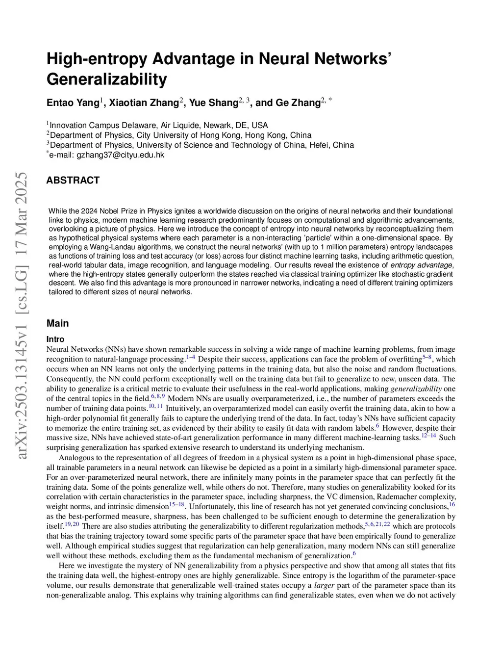 One of the central challenges in modern machine learning is understanding how neural networks generalize knowledge learned from training data to unseen test data. While numerous empirical techniques have been proposed to improve generalization, a theoretical understanding of the mechanism of generalization remains elusive. Here we introduce the concept of Boltzmann entropy into neural networks by re-conceptualizing such networks as hypothetical molecular systems where weights and biases are atomic coordinates, and the loss function is the potential energy. By employing molecular simulation algorithms, we compute entropy landscapes as functions of both training loss and test accuracy (or test loss), on networks with up to 1 million parameters, across four distinct machine learning tasks: arithmetic question, real-world tabular data, image recognition, and language modeling. Our results reveal the existence of high-entropy advantage, wherein high-entropy network states generally outperform those reached via conventional training techniques like stochastic gradient descent. This entropy advantage provides a thermodynamic explanation for neural network generalizability: the generalizable states occupy a larger part of the parameter space than its non-generalizable analog at low train loss. Furthermore, we find this advantage more pronounced in narrower neural networks, indicating a need for different training optimizers tailored to different sizes of networks.