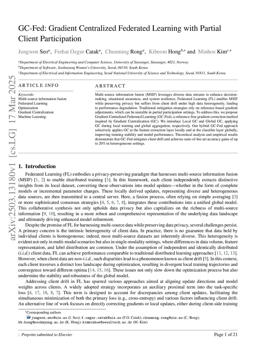 Federated Learning (FL) enables privacy-preserving multi-source information fusion (MSIF) but is challenged by client drift in highly heterogeneous data settings. Many existing drift-mitigation strategies rely on reference-based techniques--such as gradient adjustments or proximal loss--that use historical snapshots (e.g., past gradients or previous global models) as reference points. When only a subset of clients participates in each training round, these historical references may not accurately capture the overall data distribution, leading to unstable training. In contrast, our proposed Gradient Centralized Federated Learning (GC-Fed) employs a hyperplane as a historically independent reference point to guide local training and enhance inter-client alignment. GC-Fed comprises two complementary components: Local GC, which centralizes gradients during local training, and Global GC, which centralizes updates during server aggregation. In our hybrid design, Local GC is applied to feature-extraction layers to harmonize client contributions, while Global GC refines classifier layers to stabilize round-wise performance. Theoretical analysis and extensive experiments on benchmark FL tasks demonstrate that GC-Fed effectively mitigates client drift and achieves up to a 20% improvement in accuracy under heterogeneous and partial participation conditions.