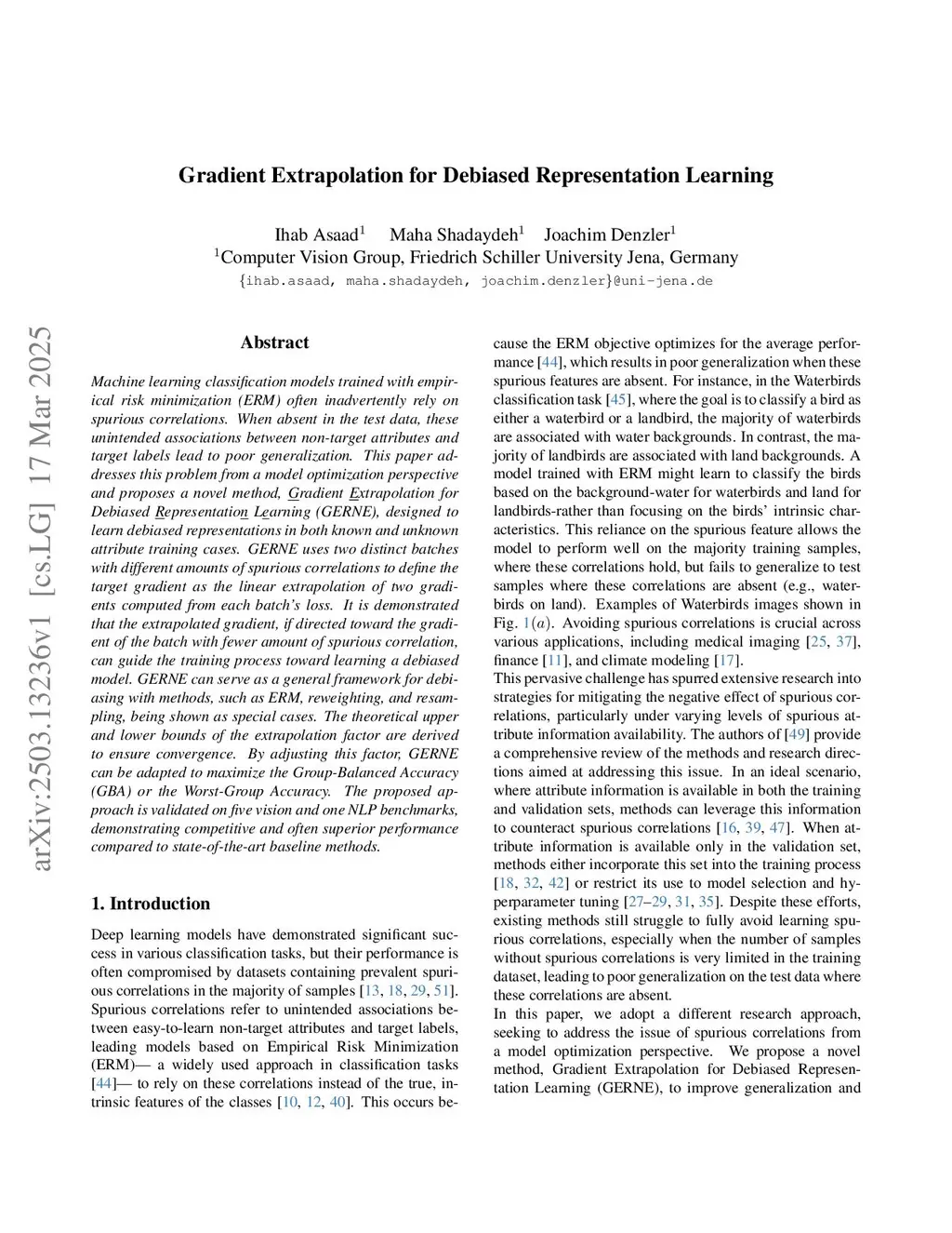 Machine learning classification models trained with empirical risk minimization (ERM) often inadvertently rely on spurious correlations. When absent in the test data, these unintended associations between non-target attributes and target labels lead to poor generalization. This paper addresses this problem from a model optimization perspective and proposes a novel method, Gradient Extrapolation for Debiased Representation Learning (GERNE), designed to learn debiased representations in both known and unknown attribute training cases. GERNE uses two distinct batches with different amounts of spurious correlations and defines the target gradient as a linear extrapolation of the gradients computed from each batch's loss. Our analysis shows that when the extrapolated gradient points toward the batch gradient with fewer spurious correlations, it effectively guides training toward learning a debiased model. GERNE serves as a general framework for debiasing, encompassing ERM and Resampling methods as special cases. We derive the theoretical upper and lower bounds of the extrapolation factor employed by GERNE. By tuning this factor, GERNE can adapt to maximize either Group-Balanced Accuracy (GBA) or Worst-Group Accuracy (WGA). We validate GERNE on five vision and one NLP benchmarks, demonstrating competitive and often superior performance compared to state-of-the-art baselines. The project page is available at:this https URL.