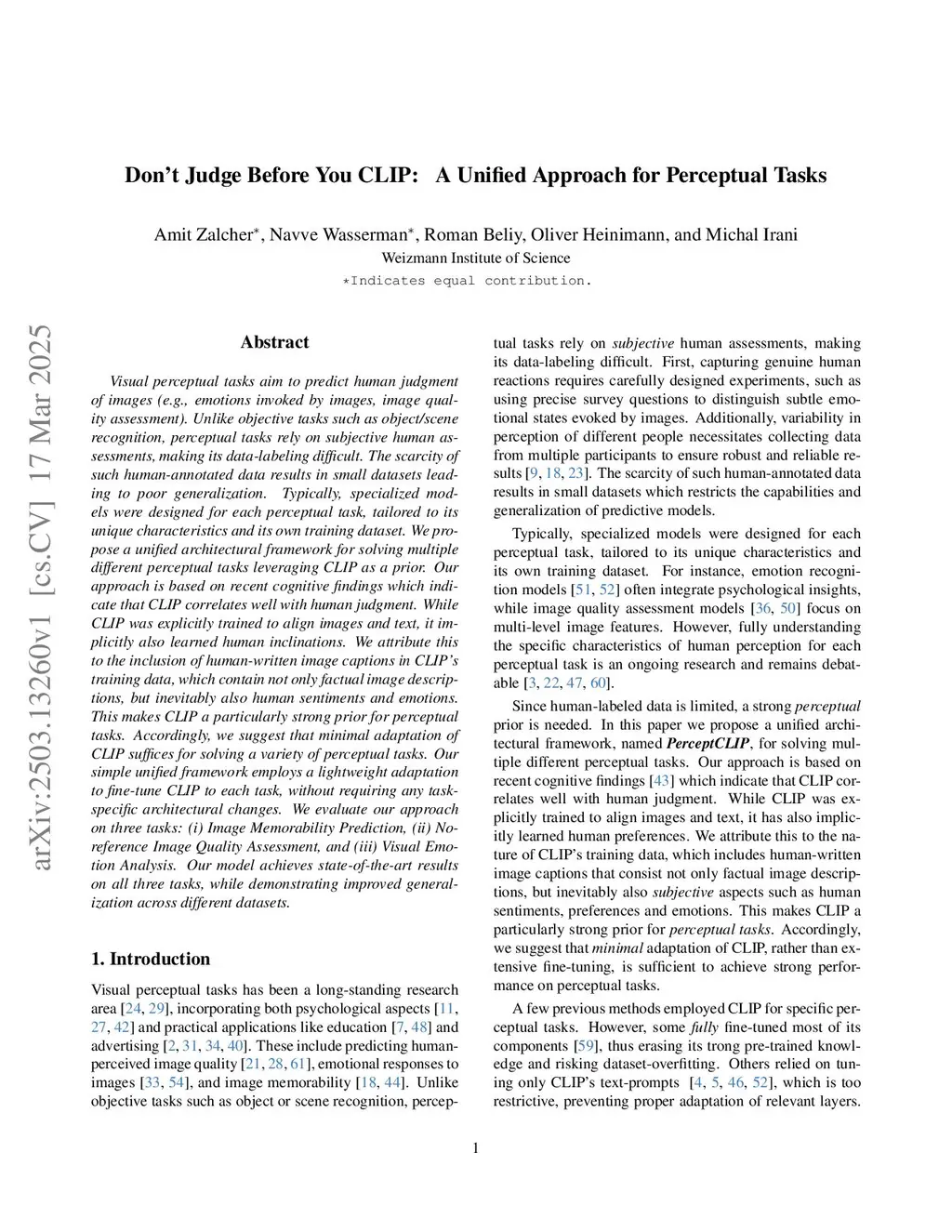 Visual perceptual tasks aim to predict human judgment of images (e.g., emotions invoked by images, image quality assessment). Unlike objective tasks such as object/scene recognition, perceptual tasks rely on subjective human assessments, making its data-labeling difficult. The scarcity of such human-annotated data results in small datasets leading to poor generalization. Typically, specialized models were designed for each perceptual task, tailored to its unique characteristics and its own training dataset. We propose a unified architectural framework for solving multiple different perceptual tasks leveraging CLIP as a prior. Our approach is based on recent cognitive findings which indicate that CLIP correlates well with human judgment. While CLIP was explicitly trained to align images and text, it implicitly also learned human inclinations. We attribute this to the inclusion of human-written image captions in CLIP's training data, which contain not only factual image descriptions, but inevitably also human sentiments and emotions. This makes CLIP a particularly strong prior for perceptual tasks. Accordingly, we suggest that minimal adaptation of CLIP suffices for solving a variety of perceptual tasks. Our simple unified framework employs a lightweight adaptation to fine-tune CLIP to each task, without requiring any task-specific architectural changes. We evaluate our approach on three tasks: (i) Image Memorability Prediction, (ii) No-reference Image Quality Assessment, and (iii) Visual Emotion Analysis. Our model achieves state-of-the-art results on all three tasks, while demonstrating improved generalization across different datasets.