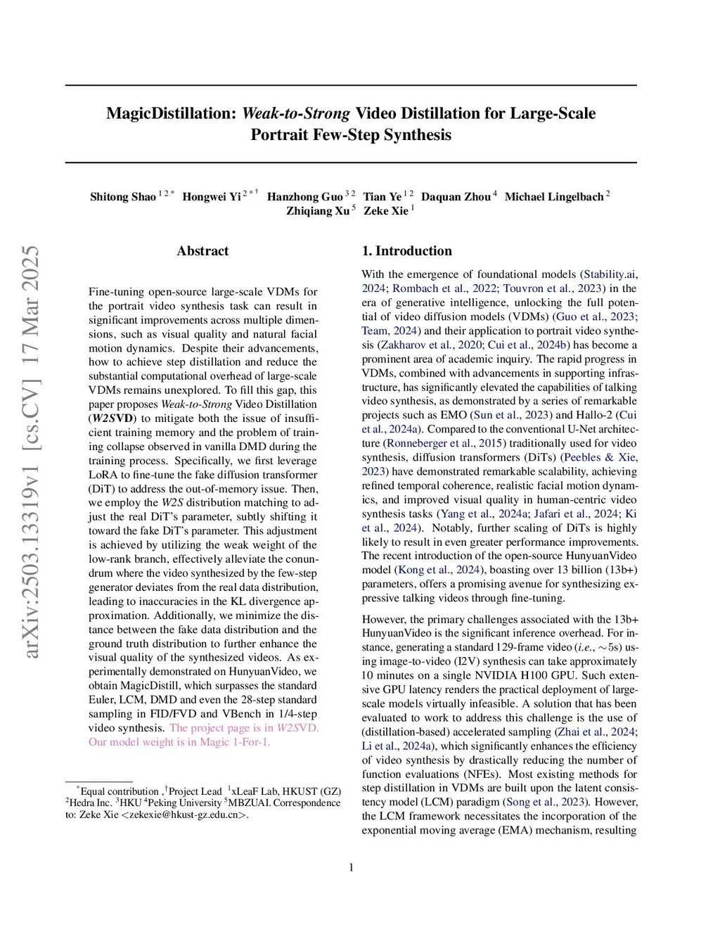 Recently, open-source video diffusion models (VDMs), such as WanX, Magic141 and HunyuanVideo, have been scaled to over 10 billion parameters. These large-scale VDMs have demonstrated significant improvements over smaller-scale VDMs across multiple dimensions, including enhanced visual quality and more natural motion dynamics. However, these models face two major limitations: (1) High inference overhead: Large-scale VDMs require approximately 10 minutes to synthesize a 28-step video on a single H100 GPU. (2) Limited in portrait video synthesis: Models like WanX-I2V and HunyuanVideo-I2V often produce unnatural facial expressions and movements in portrait videos. To address these challenges, we propose MagicDistillation, a novel framework designed to reduce inference overhead while ensuring the generalization of VDMs for portrait video synthesis. Specifically, we primarily use sufficiently high-quality talking video to fine-tune Magic141, which is dedicated to portrait video synthesis. We then employ LoRA to effectively and efficiently fine-tune the fake DiT within the step distillation framework known as distribution matching distillation (DMD). Following this, we apply weak-to-strong (W2S) distribution matching and minimize the discrepancy between the fake data distribution and the ground truth distribution, thereby improving the visual fidelity and motion dynamics of the synthesized videos. Experimental results on portrait video synthesis demonstrate the effectiveness of MagicDistillation, as our method surpasses Euler, LCM, and DMD baselines in both FID/FVD metrics and VBench. Moreover, MagicDistillation, requiring only 4 steps, also outperforms WanX-I2V (14B) and HunyuanVideo-I2V (13B) on visualization and VBench. Our project page isthis https URL.