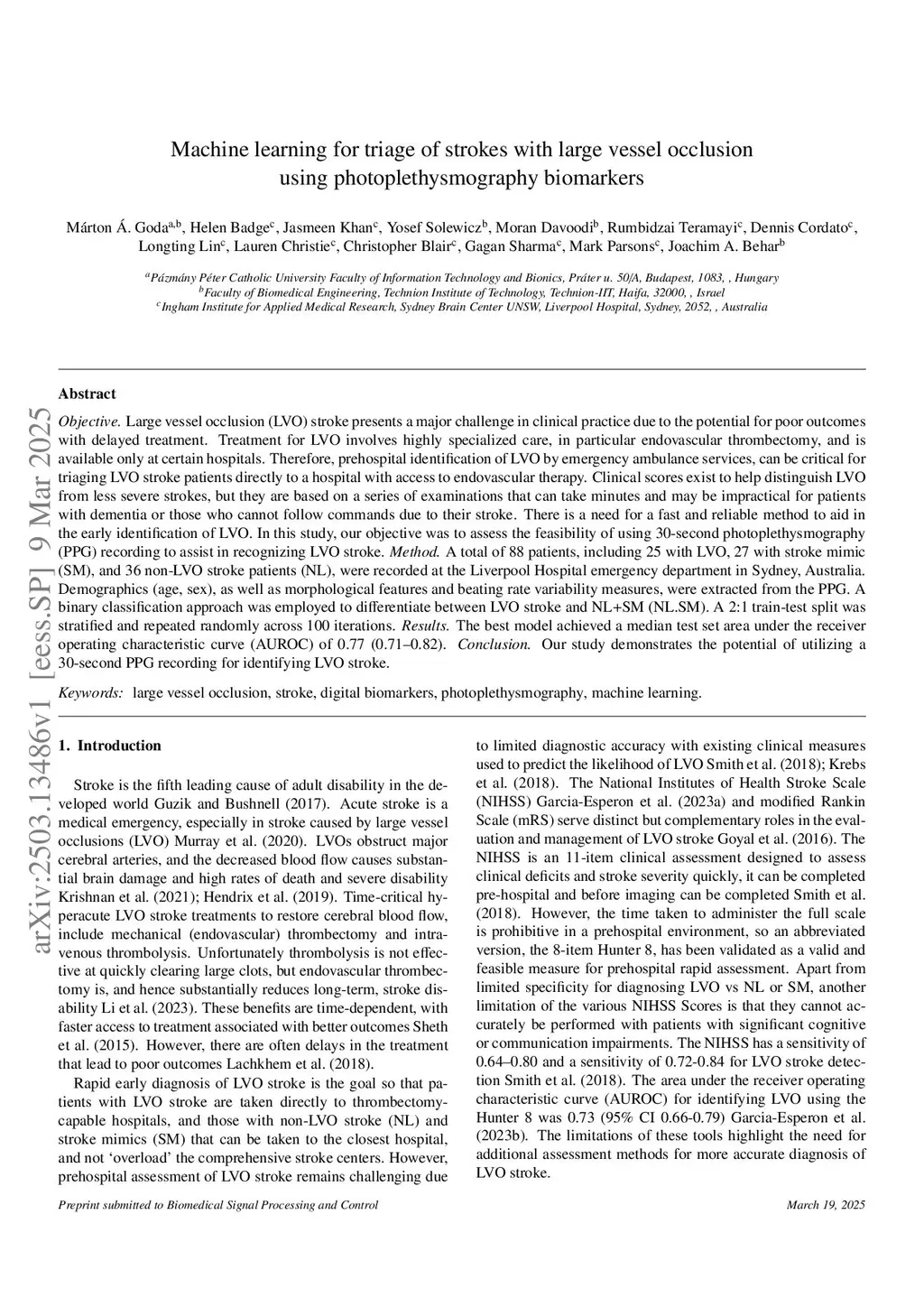 Machine learning for triage of strokes with large vessel occlusion using photoplethysmography biomarkers