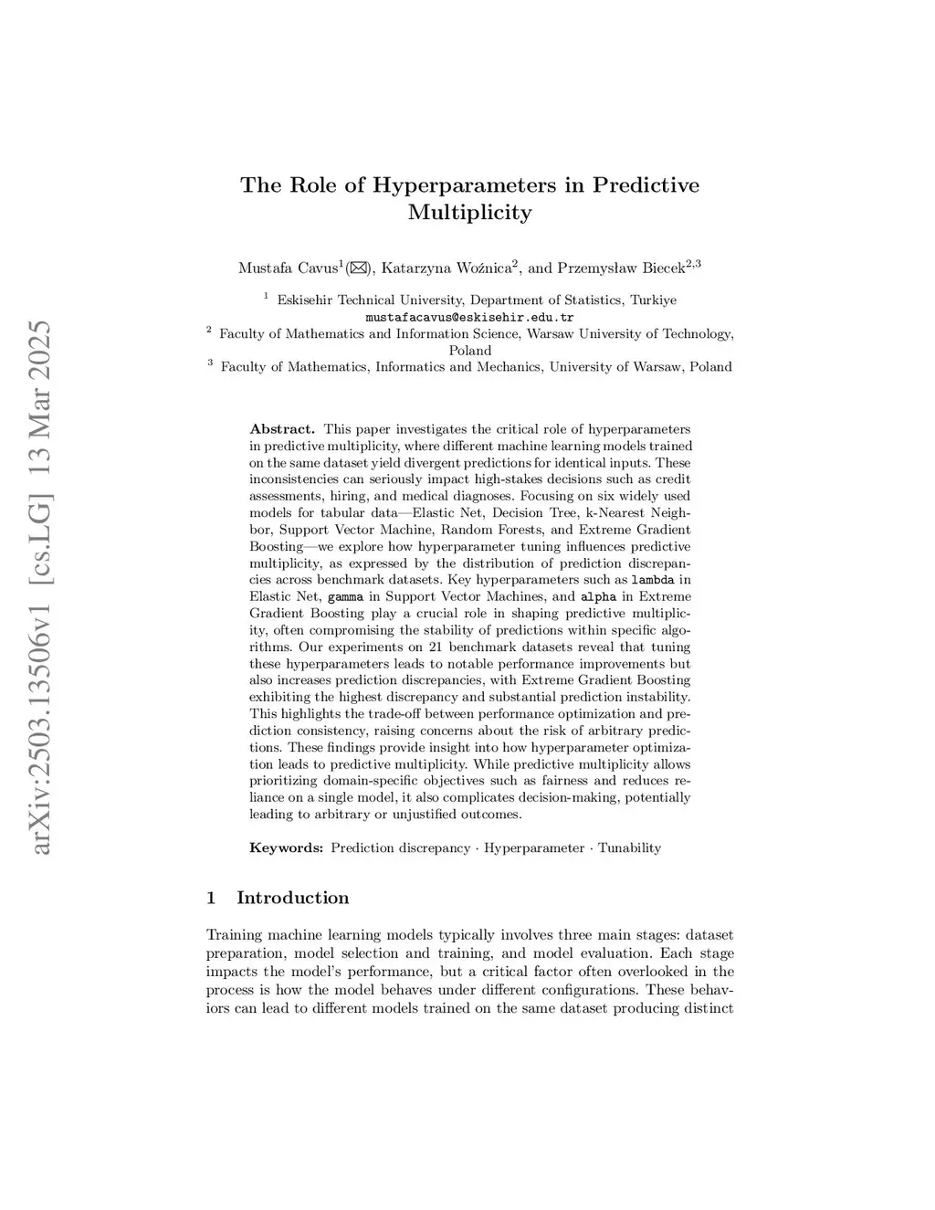 This paper investigates the critical role of hyperparameters in predictive multiplicity, where different machine learning models trained on the same dataset yield divergent predictions for identical inputs. These inconsistencies can seriously impact high-stakes decisions such as credit assessments, hiring, and medical diagnoses. Focusing on six widely used models for tabular data - Elastic Net, Decision Tree, k-Nearest Neighbor, Support Vector Machine, Random Forests, and Extreme Gradient Boosting - we explore how hyperparameter tuning influences predictive multiplicity, as expressed by the distribution of prediction discrepancies across benchmark datasets. Key hyperparameters such as lambda in Elastic Net, gamma in Support Vector Machines, and alpha in Extreme Gradient Boosting play a crucial role in shaping predictive multiplicity, often compromising the stability of predictions within specific algorithms. Our experiments on 21 benchmark datasets reveal that tuning these hyperparameters leads to notable performance improvements but also increases prediction discrepancies, with Extreme Gradient Boosting exhibiting the highest discrepancy and substantial prediction instability. This highlights the trade-off between performance optimization and prediction consistency, raising concerns about the risk of arbitrary predictions. These findings provide insight into how hyperparameter optimization leads to predictive multiplicity. While predictive multiplicity allows prioritizing domain-specific objectives such as fairness and reduces reliance on a single model, it also complicates decision-making, potentially leading to arbitrary or unjustified outcomes.