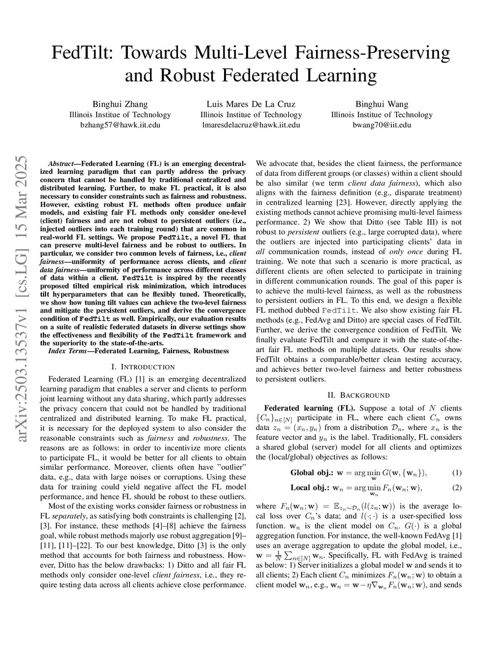 Federated Learning (FL) is an emerging decentralized learning paradigm that can partly address the privacy concern that cannot be handled by traditional centralized and distributed learning. Further, to make FL practical, it is also necessary to consider constraints such as fairness and robustness. However, existing robust FL methods often produce unfair models, and existing fair FL methods only consider one-level (client) fairness and are not robust to persistent outliers (i.e., injected outliers into each training round) that are common in real-world FL settings. We propose \texttt{FedTilt}, a novel FL that can preserve multi-level fairness and be robust to outliers. In particular, we consider two common levels of fairness, i.e., \emph{client fairness} -- uniformity of performance across clients, and \emph{client data fairness} -- uniformity of performance across different classes of data within a client. \texttt{FedTilt} is inspired by the recently proposed tilted empirical risk minimization, which introduces tilt hyperparameters that can be flexibly tuned. Theoretically, we show how tuning tilt values can achieve the two-level fairness and mitigate the persistent outliers, and derive the convergence condition of \texttt{FedTilt} as well. Empirically, our evaluation results on a suite of realistic federated datasets in diverse settings show the effectiveness and flexibility of the \texttt{FedTilt} framework and the superiority to the state-of-the-arts.