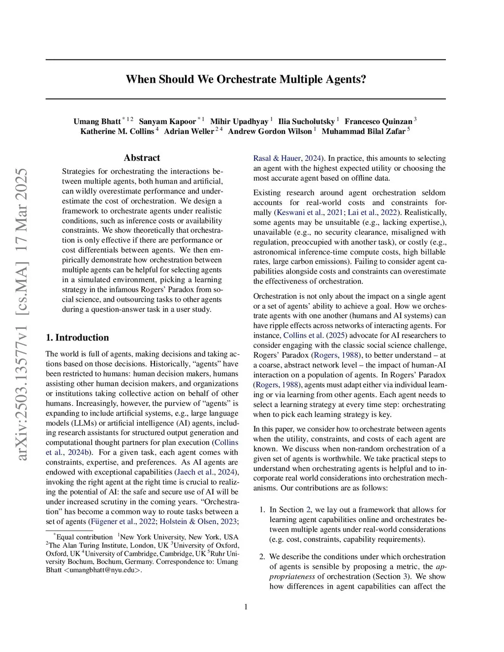 Strategies for orchestrating the interactions between multiple agents, both human and artificial, can wildly overestimate performance and underestimate the cost of orchestration. We design a framework to orchestrate agents under realistic conditions, such as inference costs or availability constraints. We show theoretically that orchestration is only effective if there are performance or cost differentials between agents. We then empirically demonstrate how orchestration between multiple agents can be helpful for selecting agents in a simulated environment, picking a learning strategy in the infamous Rogers' Paradox from social science, and outsourcing tasks to other agents during a question-answer task in a user study.