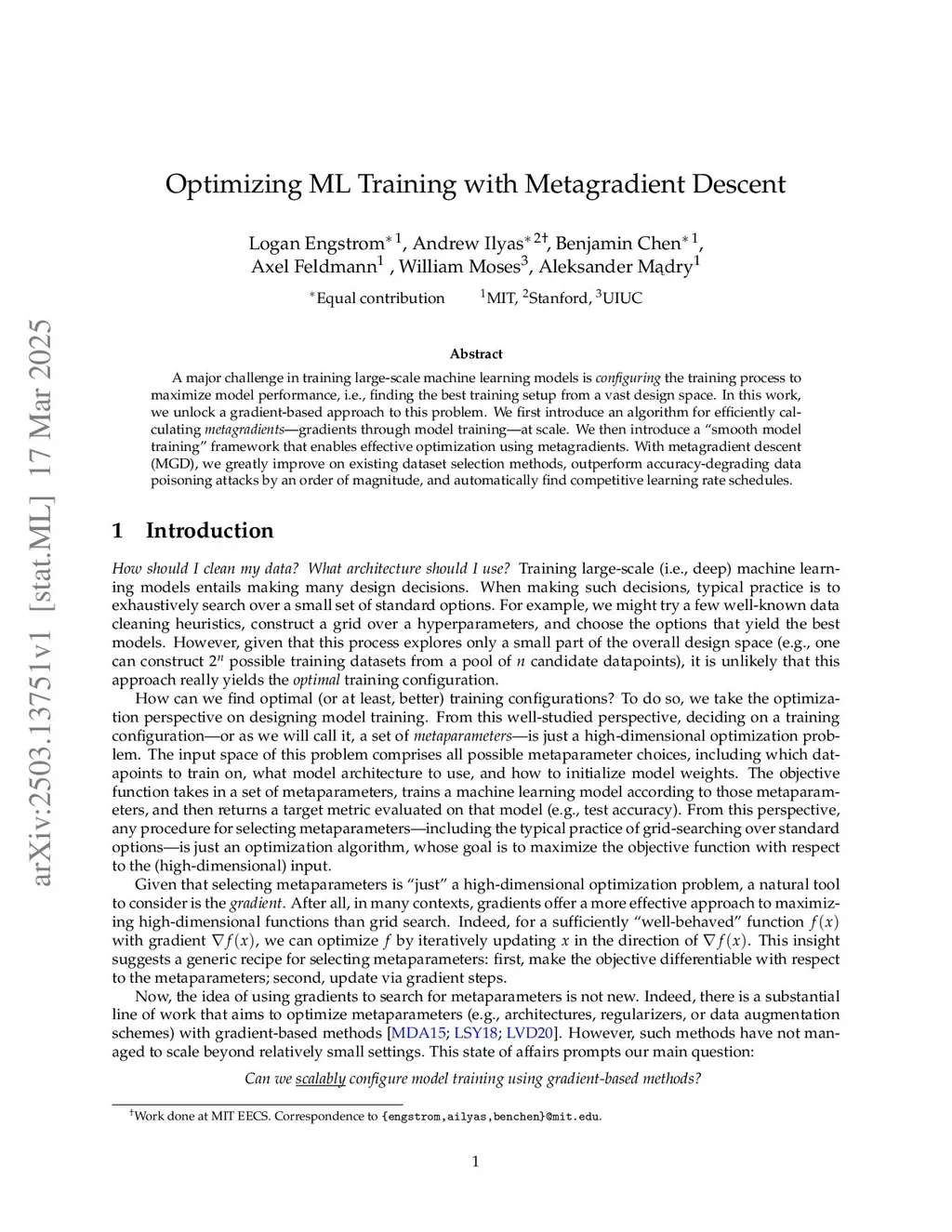 A major challenge in training large-scale machine learning models is configuring the training process to maximize model performance, i.e., finding the best training setup from a vast design space. In this work, we unlock a gradient-based approach to this problem. We first introduce an algorithm for efficiently calculating metagradients -- gradients through model training -- at scale. We then introduce a "smooth model training" framework that enables effective optimization using metagradients. With metagradient descent (MGD), we greatly improve on existing dataset selection methods, outperform accuracy-degrading data poisoning attacks by an order of magnitude, and automatically find competitive learning rate schedules.