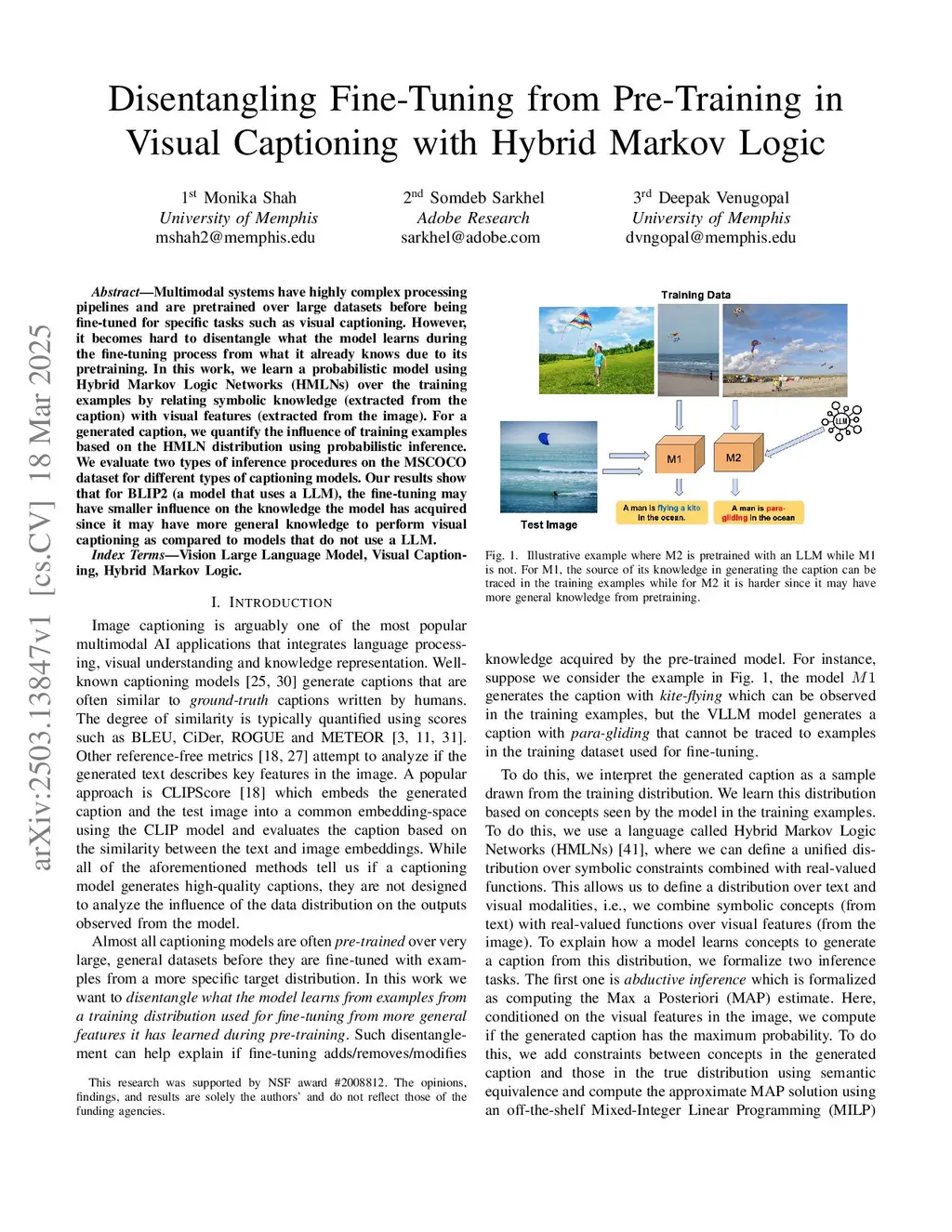 Multimodal systems have highly complex processing pipelines and are pretrained over large datasets before being fine-tuned for specific tasks such as visual captioning. However, it becomes hard to disentangle what the model learns during the fine-tuning process from what it already knows due to its pretraining. In this work, we learn a probabilistic model using Hybrid Markov Logic Networks (HMLNs) over the training examples by relating symbolic knowledge (extracted from the caption) with visual features (extracted from the image). For a generated caption, we quantify the influence of training examples based on the HMLN distribution using probabilistic inference. We evaluate two types of inference procedures on the MSCOCO dataset for different types of captioning models. Our results show that for BLIP2 (a model that uses a LLM), the fine-tuning may have smaller influence on the knowledge the model has acquired since it may have more general knowledge to perform visual captioning as compared to models that do not use a LLM