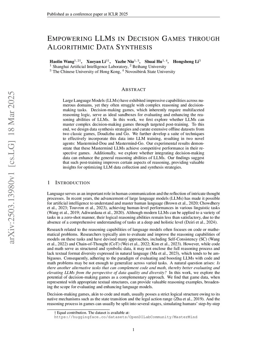 Large Language Models (LLMs) have exhibited impressive capabilities across numerous domains, yet they often struggle with complex reasoning and decision-making tasks. Decision-making games, which inherently require multifaceted reasoning logic, serve as ideal sandboxes for evaluating and enhancing the reasoning abilities of LLMs. In this work, we first explore whether LLMs can master complex decision-making games through targeted post-training. To this end, we design data synthesis strategies and curate extensive offline datasets from two classic games, Doudizhu and Go. We further develop a suite of techniques to effectively incorporate this data into LLM training, resulting in two novel agents: Mastermind-Dou and Mastermind-Go. Our experimental results demonstrate that these Mastermind LLMs achieve competitive performance in their respective games. Additionally, we explore whether integrating decision-making data can enhance the general reasoning abilities of LLMs. Our findings suggest that such post-training improves certain aspects of reasoning, providing valuable insights for optimizing LLM data collection and synthesis strategies.