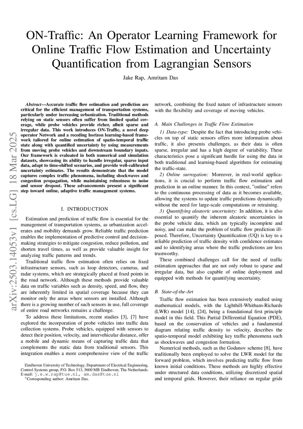 ON-Traffic: An Operator Learning Framework for Online Traffic Flow Estimation and Uncertainty Quantification from Lagrangian Sensors